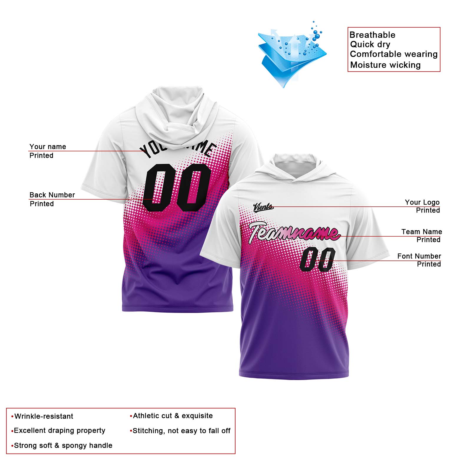 Benutzerdefinierte Weiß Rosa Violett Kurzarm-Kapuzenpullover für Männer Frauen Hemden mit Kapuzen gedruckt Name Logo