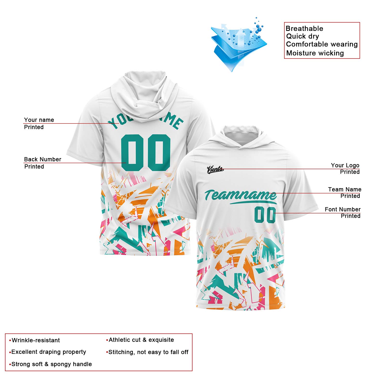 Benutzerdefinierte Weiß Teal Kurzarm-Kapuzenpullover für Männer Frauen Hemden mit Kapuzen gedruckt Name Logo