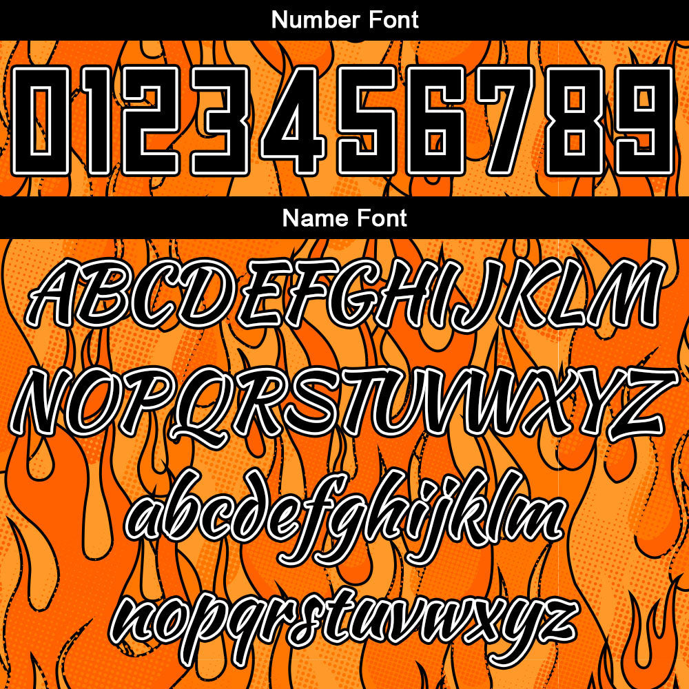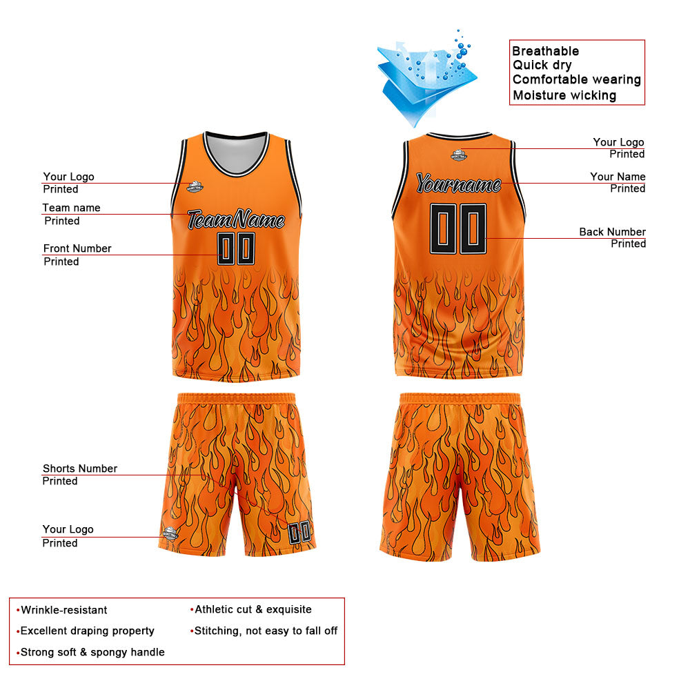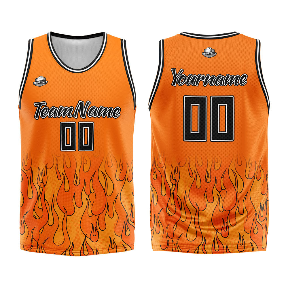 Benutzerdefinierter Basketball Jersey Uniform Anzug gedruckt Ihr Logo Name Nummer Orange Flamme