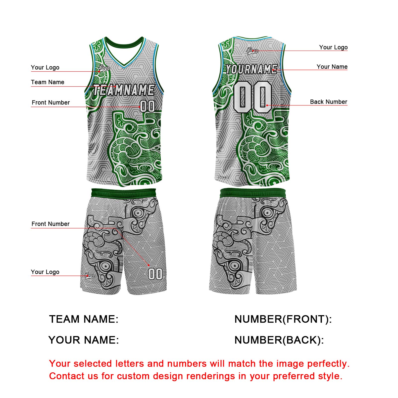 Benutzerdefinierter Grau Grün Basketball Jersey Uniform Anzug gedruckt Ihr Logo Name Nummer
