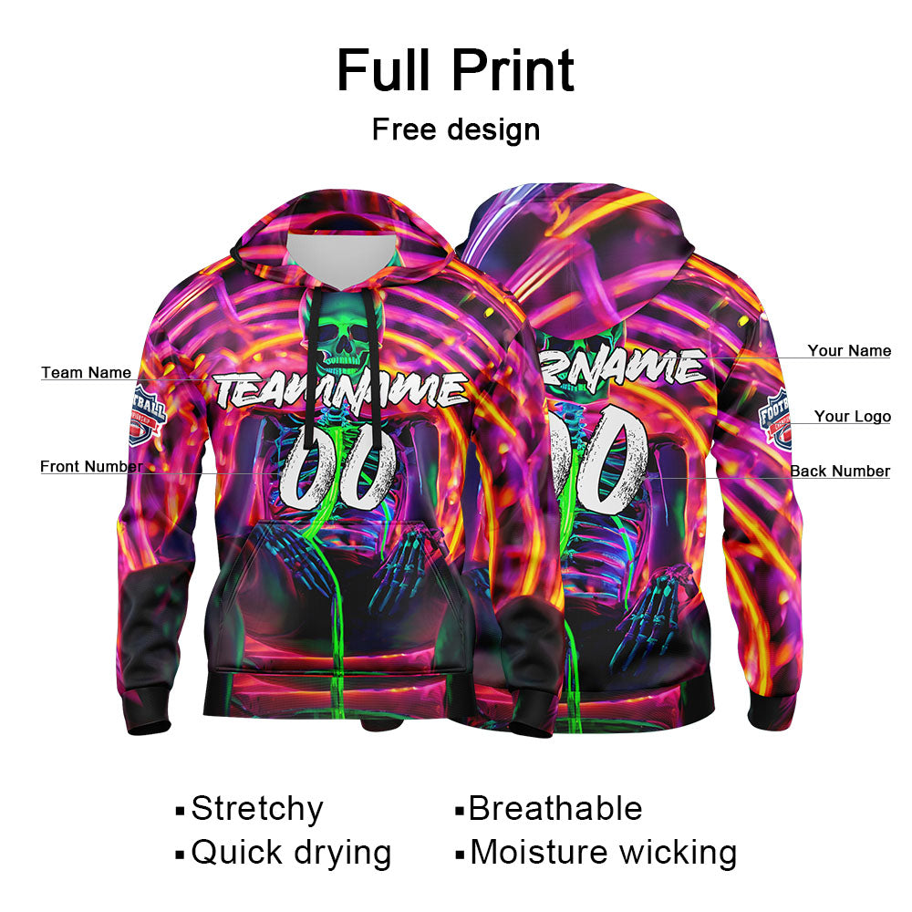 Benutzerdefinierter Sweatshirt-Hoodie für Mann, Frau, Mädchen, Junge. Drucken Sie Ihr Logo, Ihren Namen und Ihre Nummer Neon Skelett