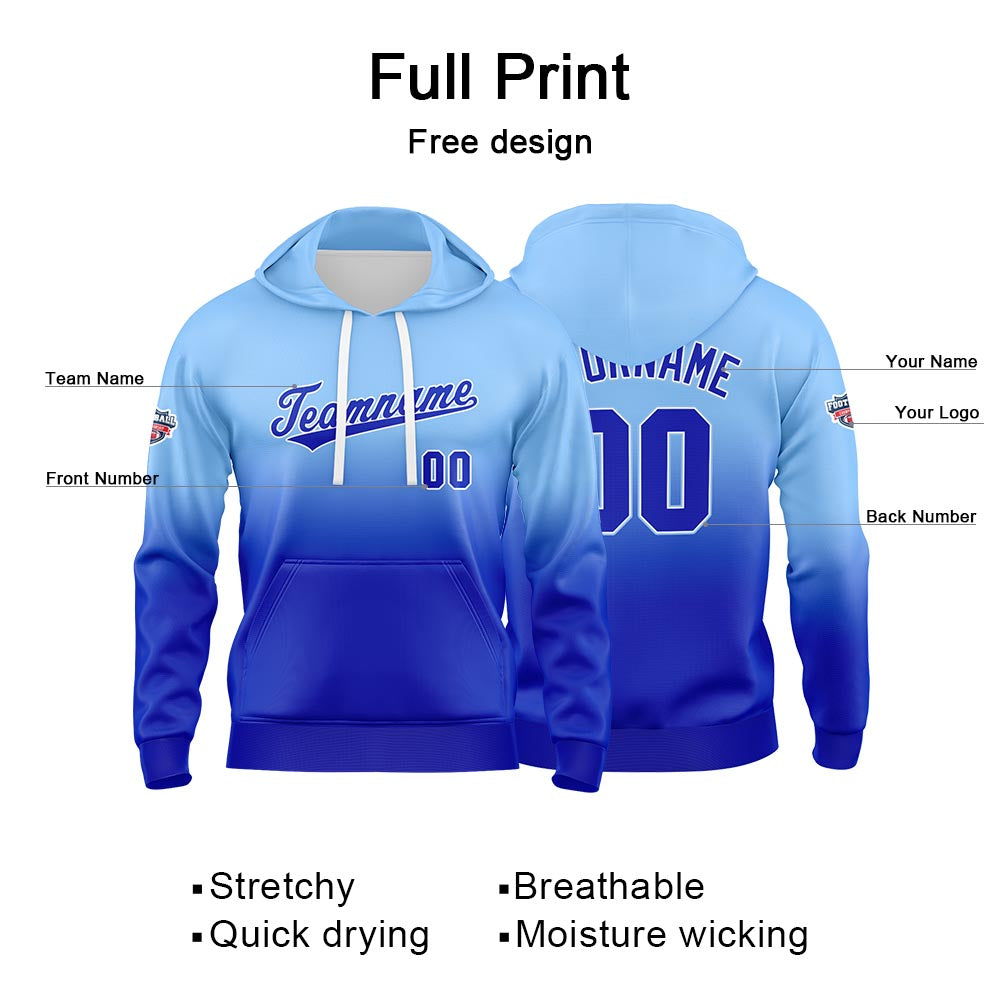Benutzerdefinierter Verlauf Hoodie für Mann, Frau, Mädchen, Junge. Drucken Sie Ihr Logo, Ihren Namen und Ihre Nummer Hellblau Royal