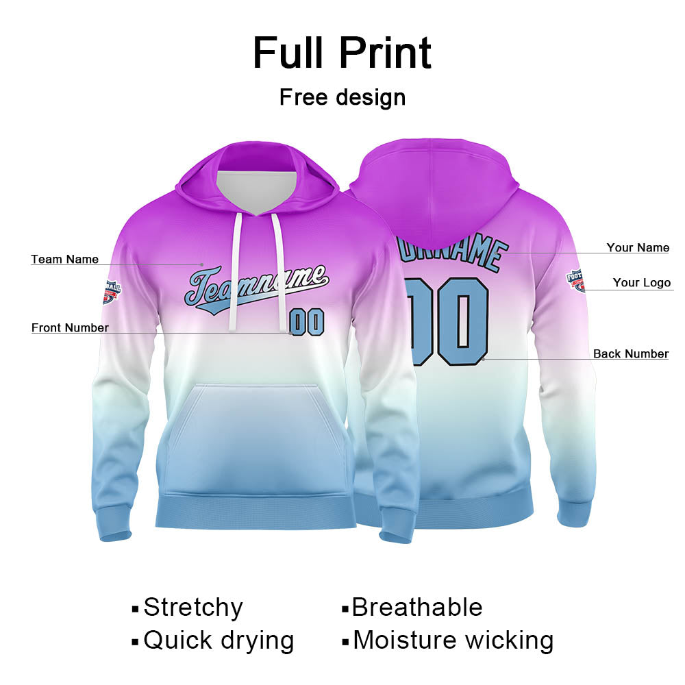 Benutzerdefinierter Verlauf Hoodie für Mann, Frau, Mädchen, Junge. Drucken Sie Ihr Logo, Ihren Namen und Ihre Nummer Lila Weiß