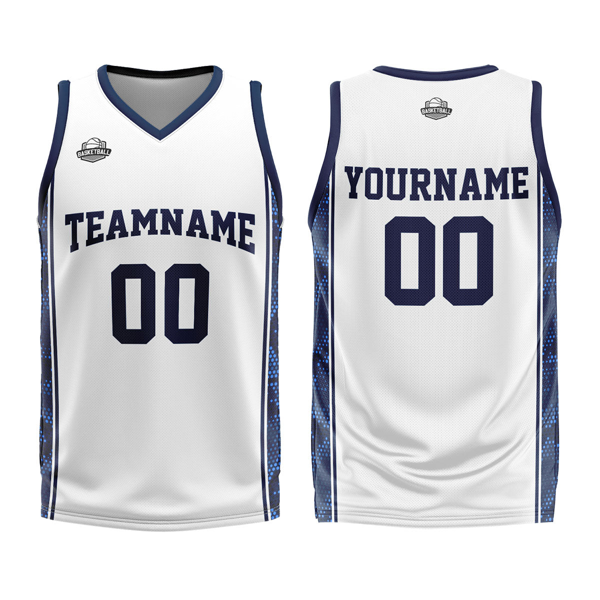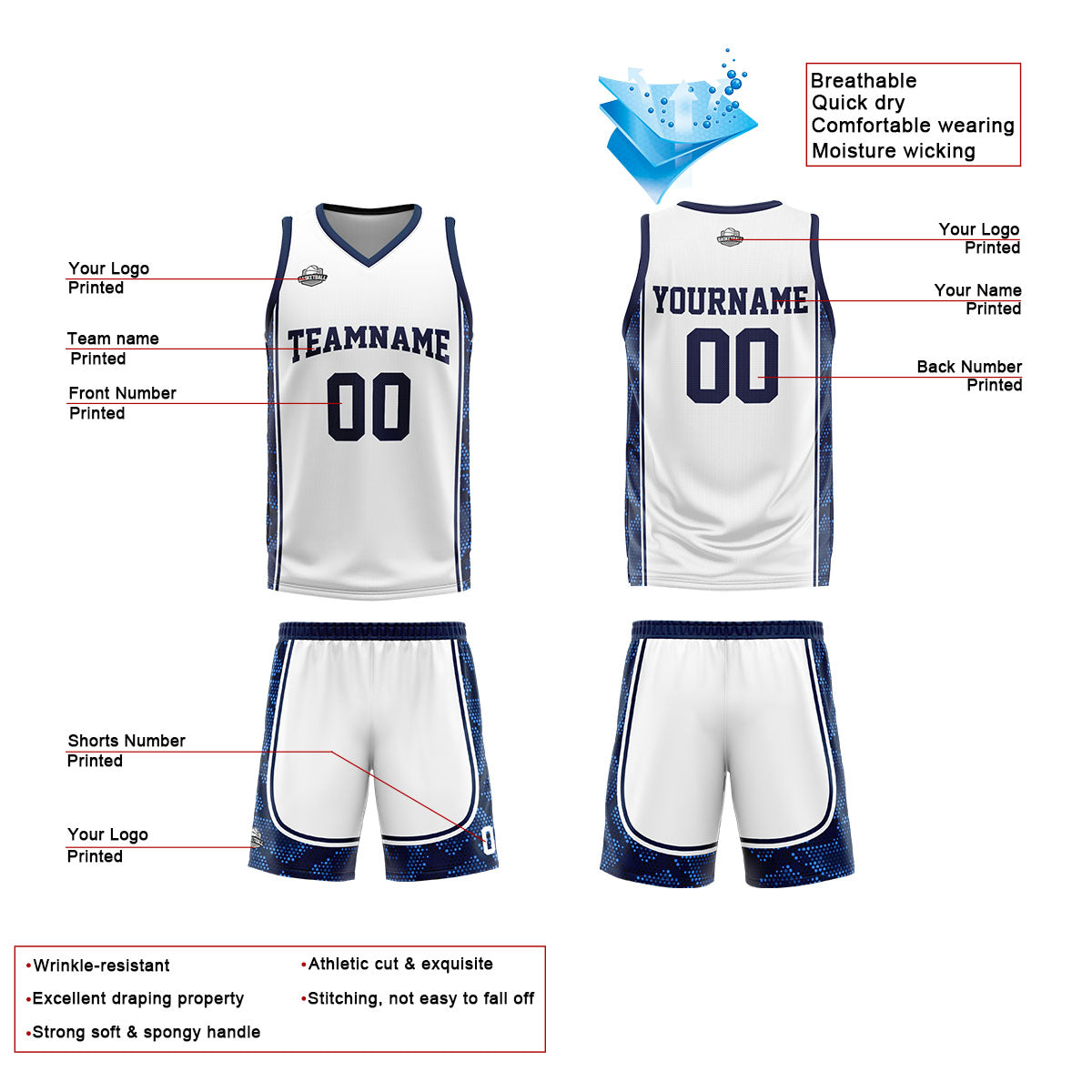Benutzerdefinierter Weiß Dunkelblau Basketball Jersey Uniform Anzug gedruckt Ihr Logo Name Nummer