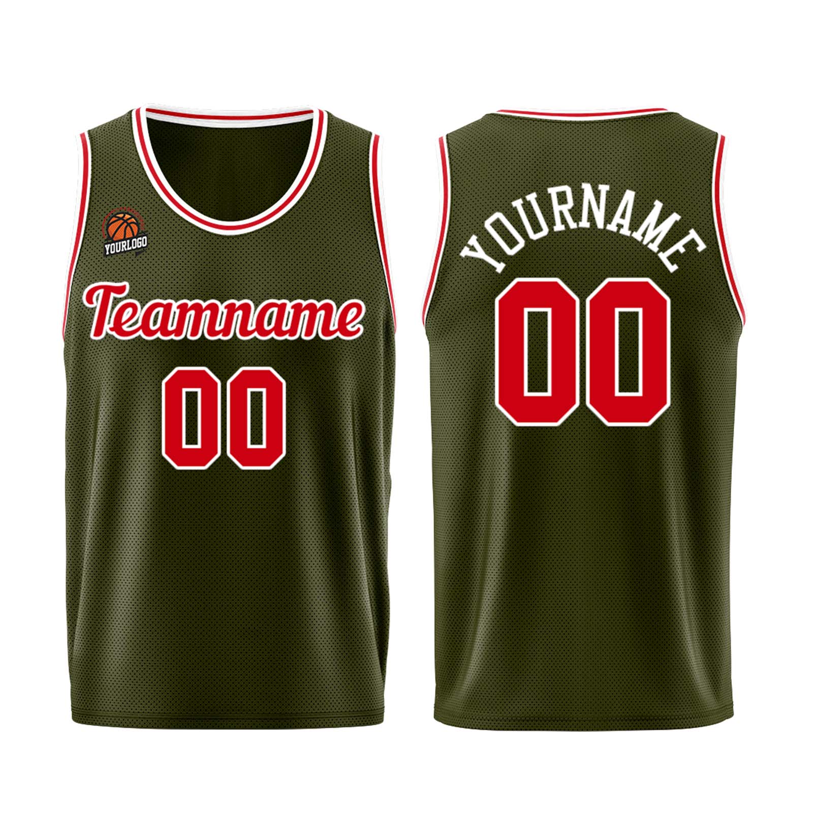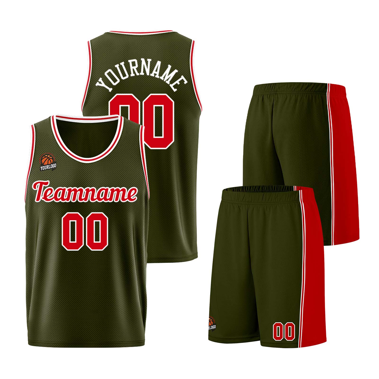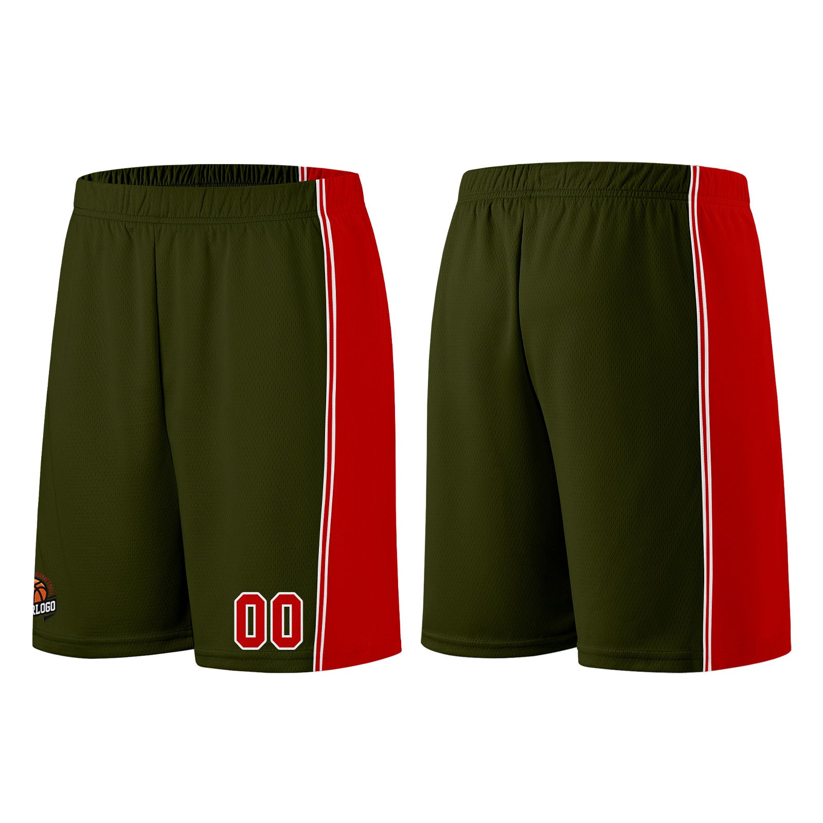 Individuelle Armeegrün-Rot Basketball Jersey Shorts für Männer und Frauen Gestickter und gedruckter Name, Nummer und Logo