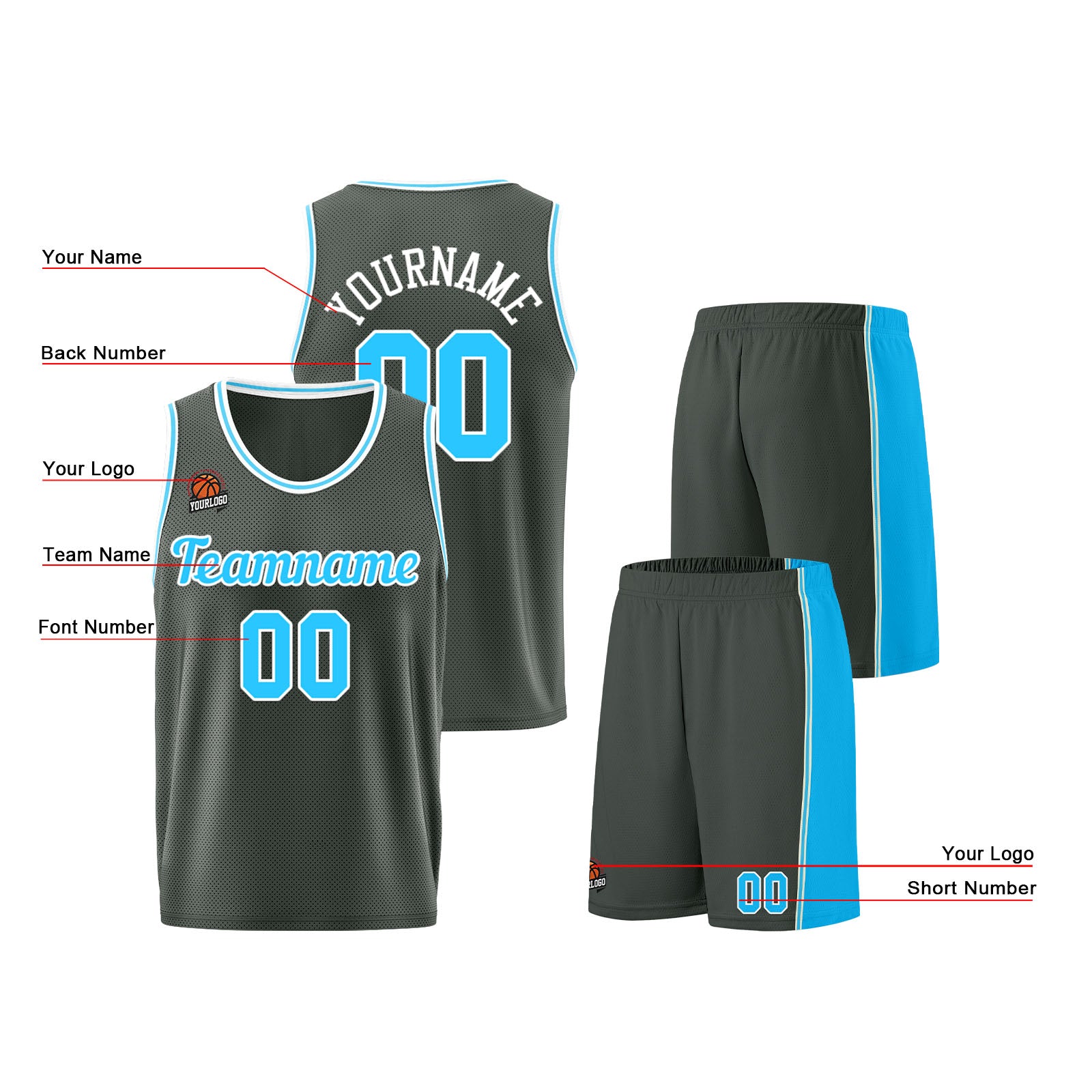Individuelle Dunkelgrau-Hellblau Basketball Jersey Shorts für Männer und Frauen Gestickter und gedruckter Name, Nummer und Logo