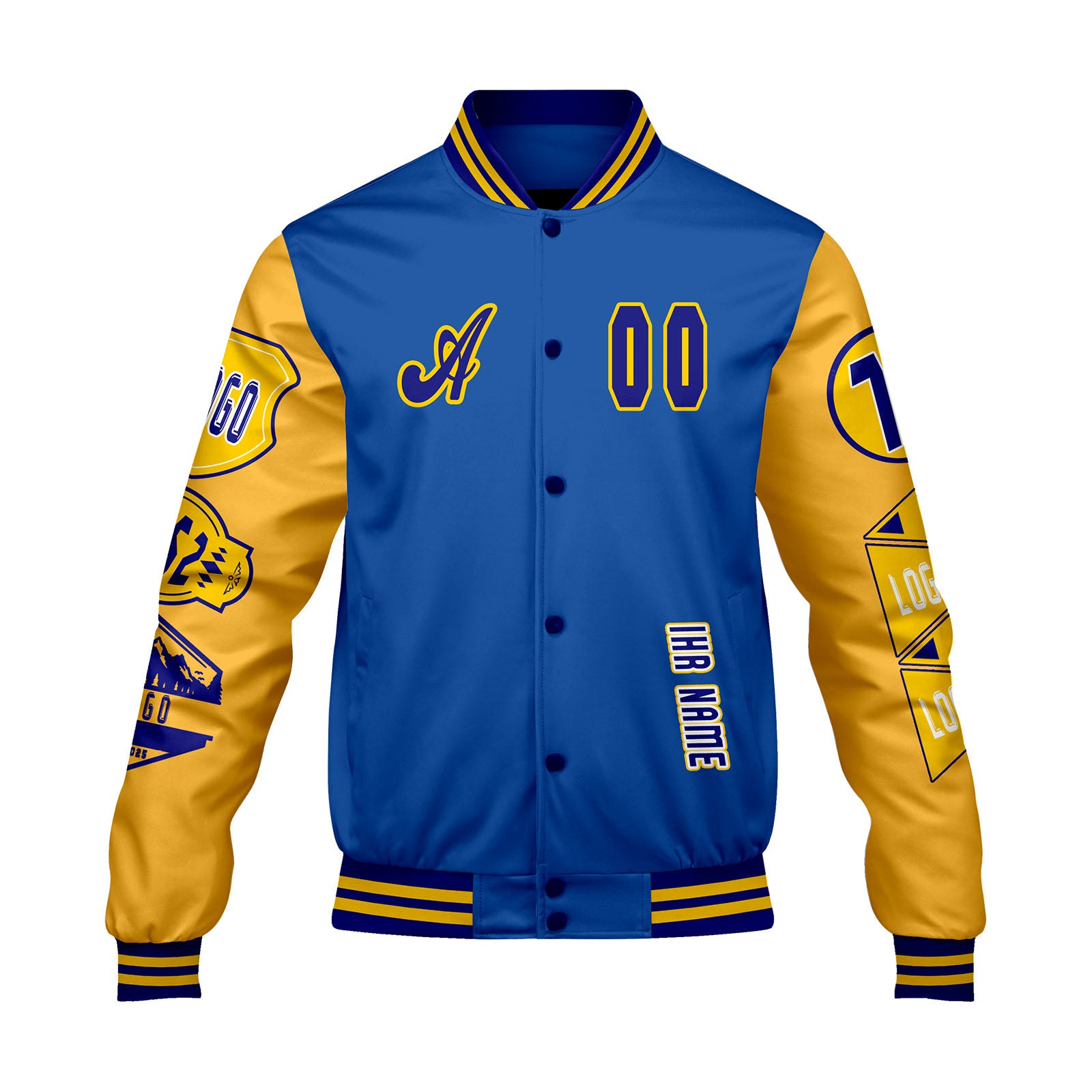Maßgeschneiderte Blau Gelb Letterman Varsity Jacket Individuelle Stickerei Druck nach Ihrem Wunsch