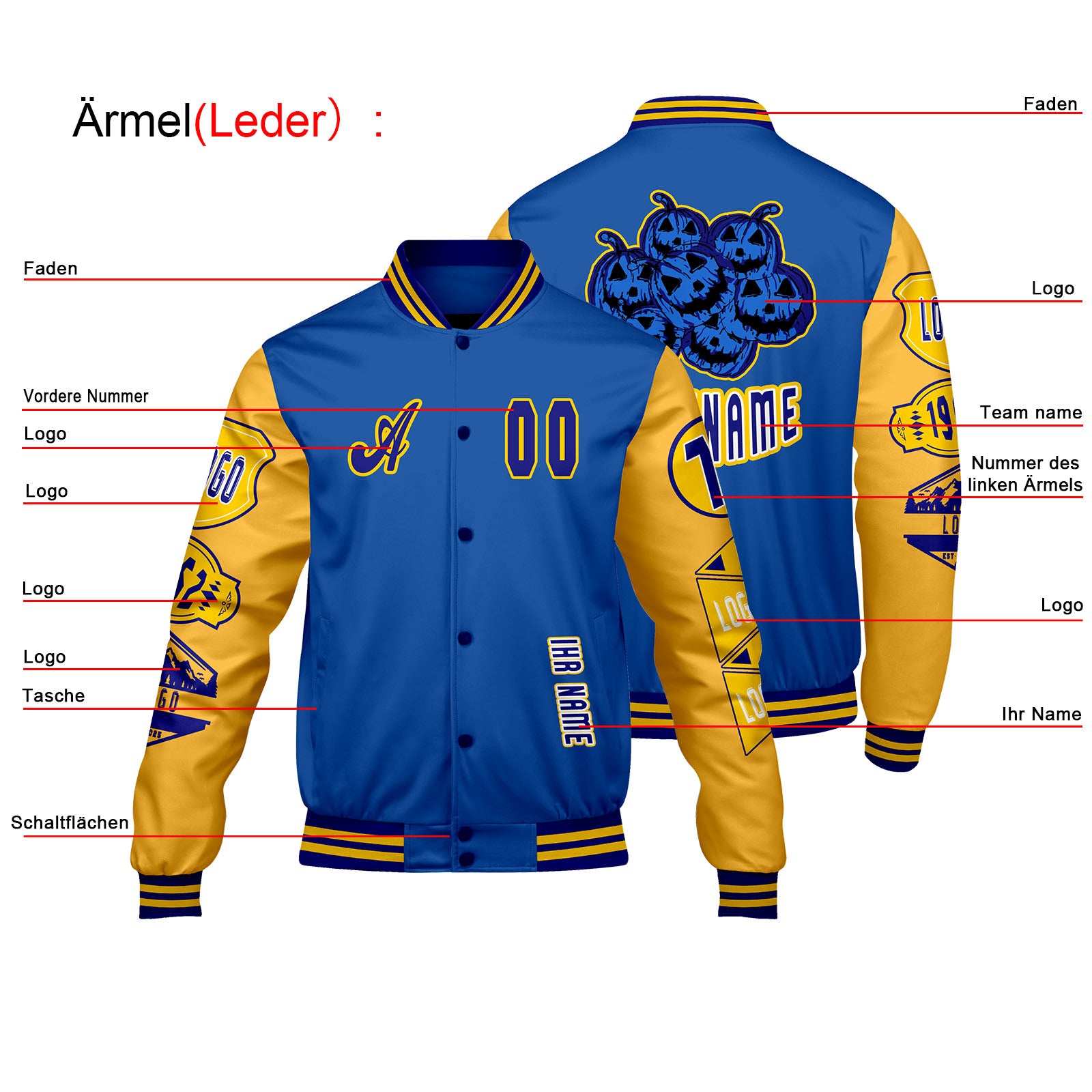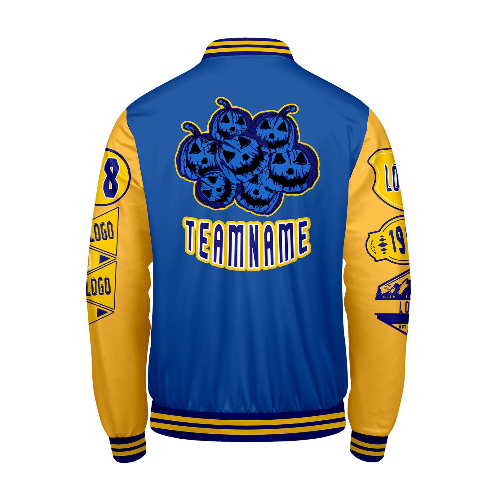 Maßgeschneiderte Blau Gelb Letterman Varsity Jacket Individuelle Stickerei  Druck nach Ihrem Wunsch