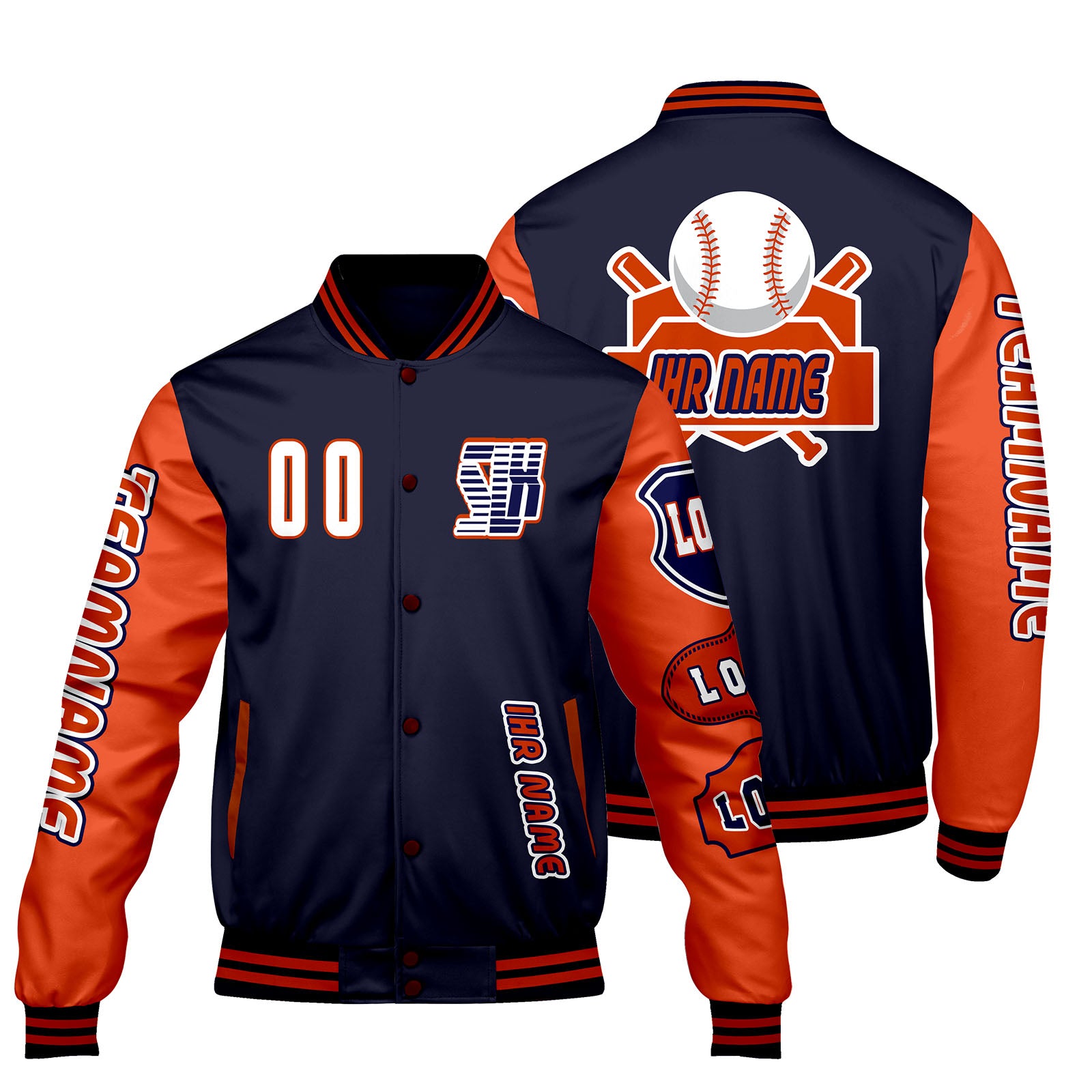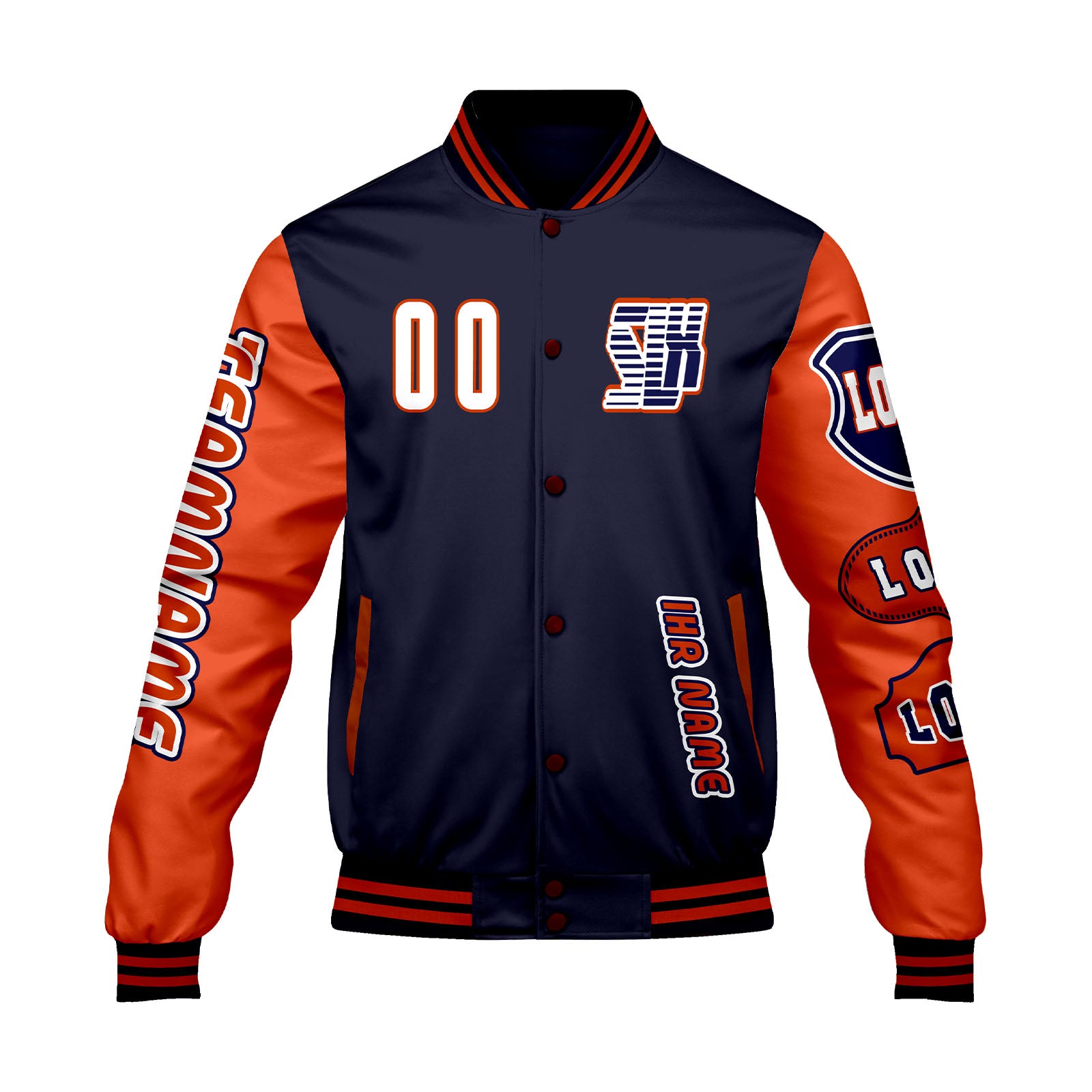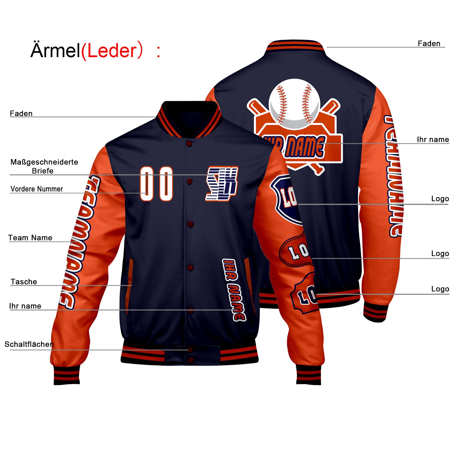 Maßgeschneiderte Marine Orange Letterman Varsity Jacket Individuelle Stickerei Druck nach Ihrem Wunsch