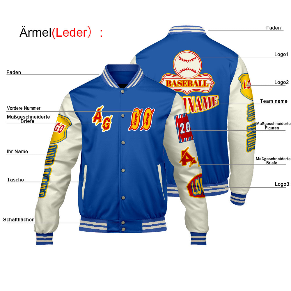 Maßgeschneiderte Blau Gelb Letterman Varsity Jacket Individuelle Stickerei Druck nach Ihrem Wunsch