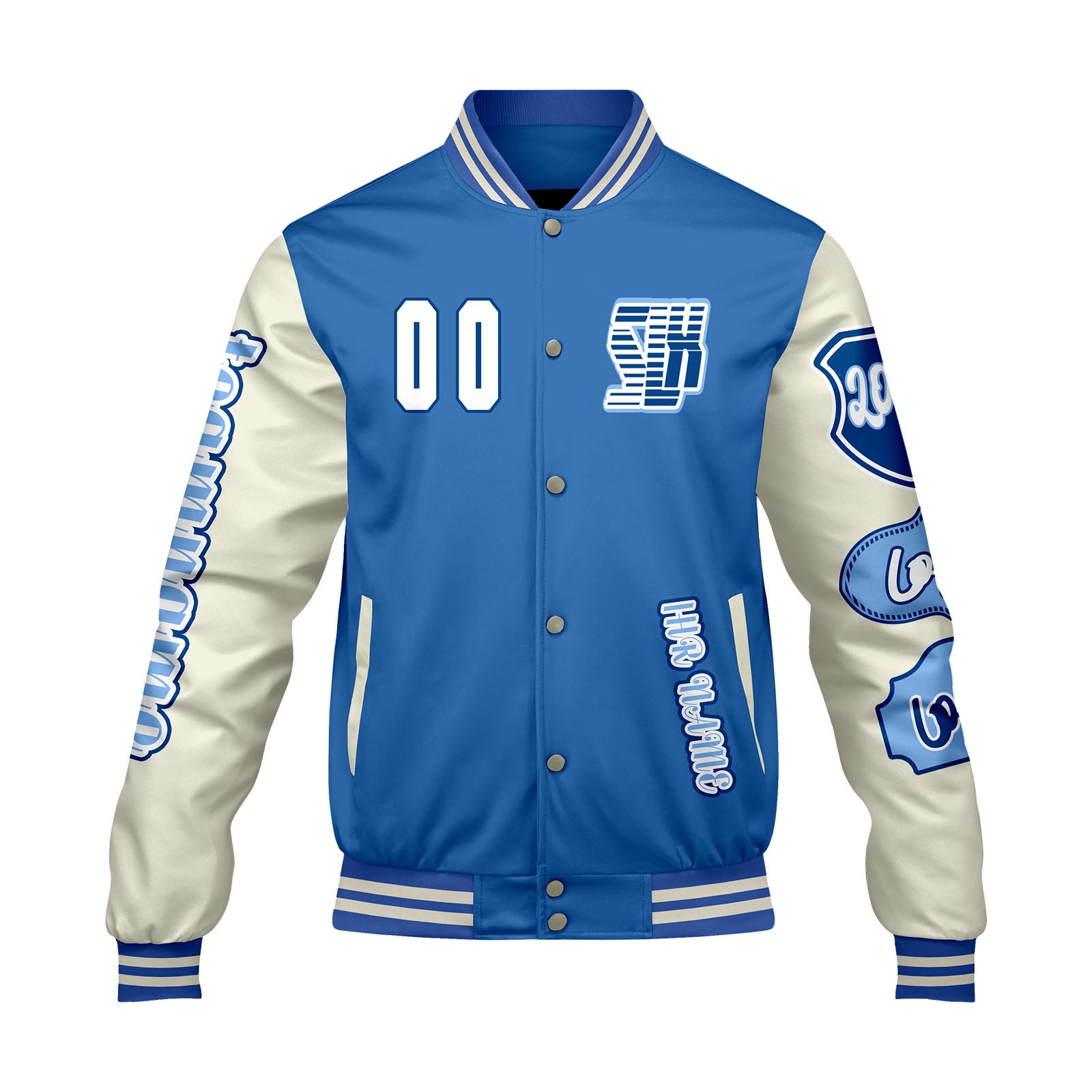 Maßgeschneiderte Blau Weiß Letterman Varsity Jacket Individuelle Stickerei Druck nach Ihrem Wunsch