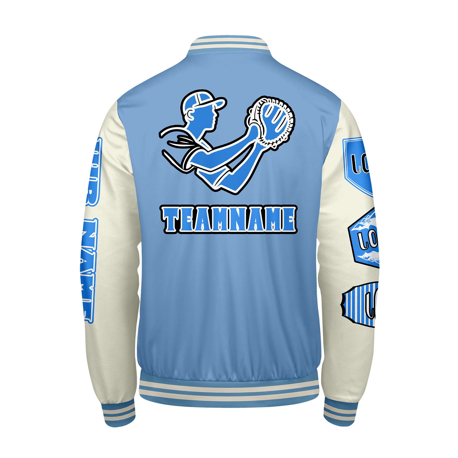 Maßgeschneiderte Blau Weiß Letterman Varsity Jacket Individuelle Stickerei  Druck nach Ihrem Wunsch