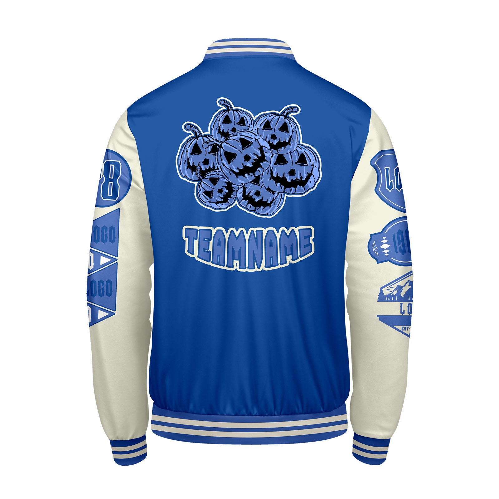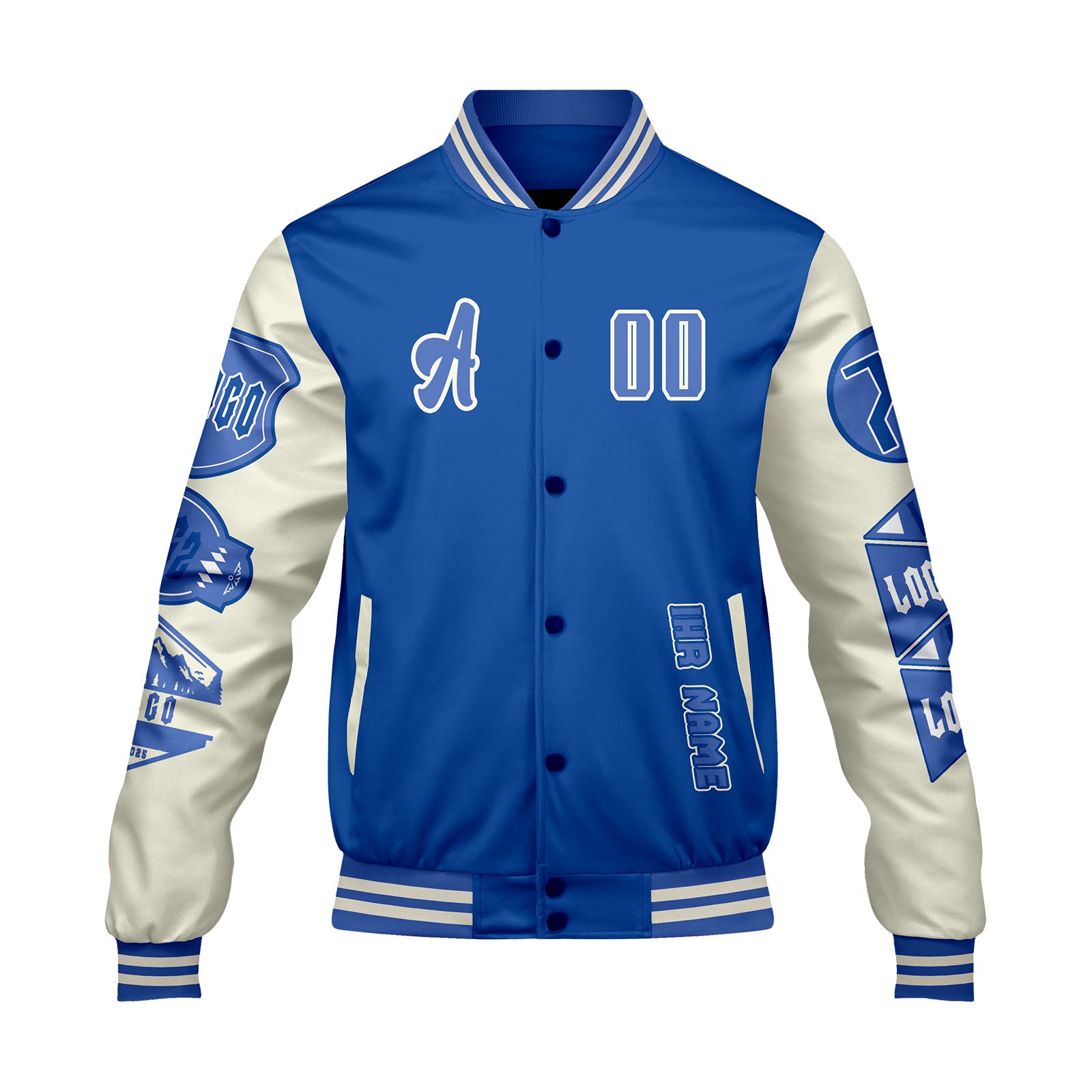 Maßgeschneiderte Blau Weiß Letterman Varsity Jacket Individuelle Stickerei  Druck nach Ihrem Wunsch