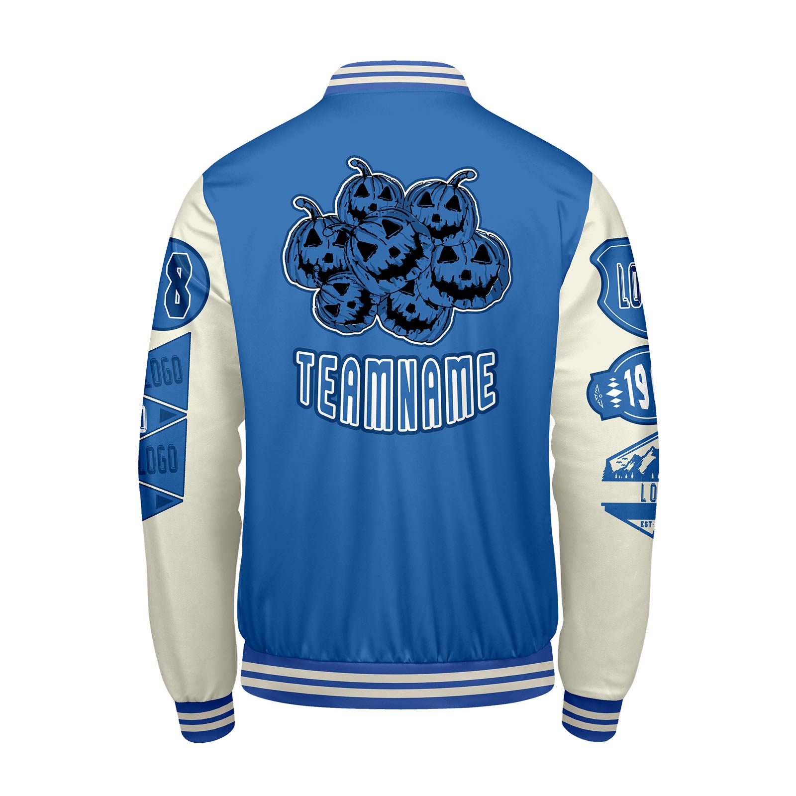Maßgeschneiderte Blau Weiß Letterman Varsity Jacket Individuelle Stickerei  Druck nach Ihrem Wunsch
