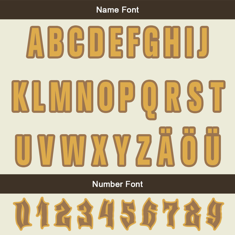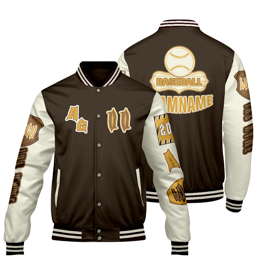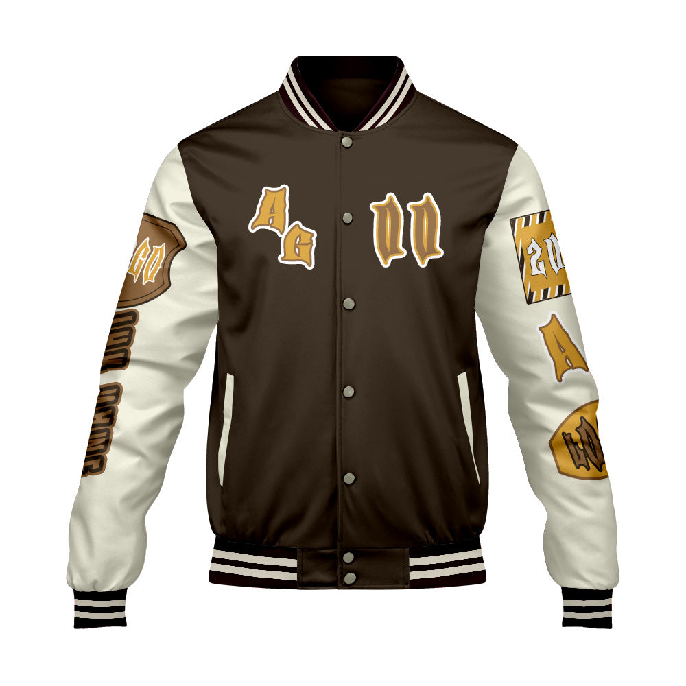 Maßgeschneiderte Braun Gelb Letterman Varsity Jacket Individuelle Stickerei Druck nach Ihrem Wunsch