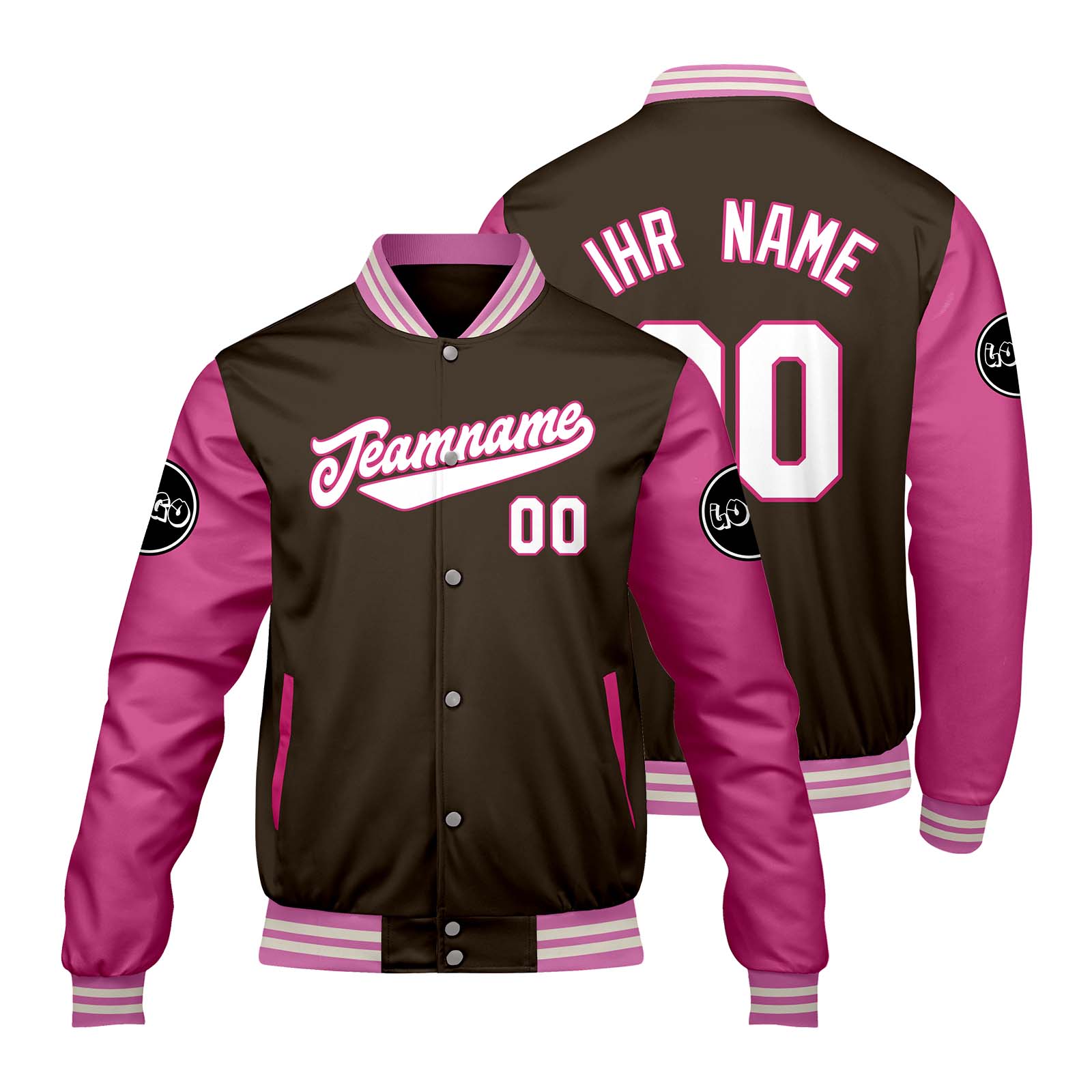Maßgeschneiderte Braun Rosa Letterman Varsity Jacket Individuelle Stickerei Druck nach Ihrem Wunsch