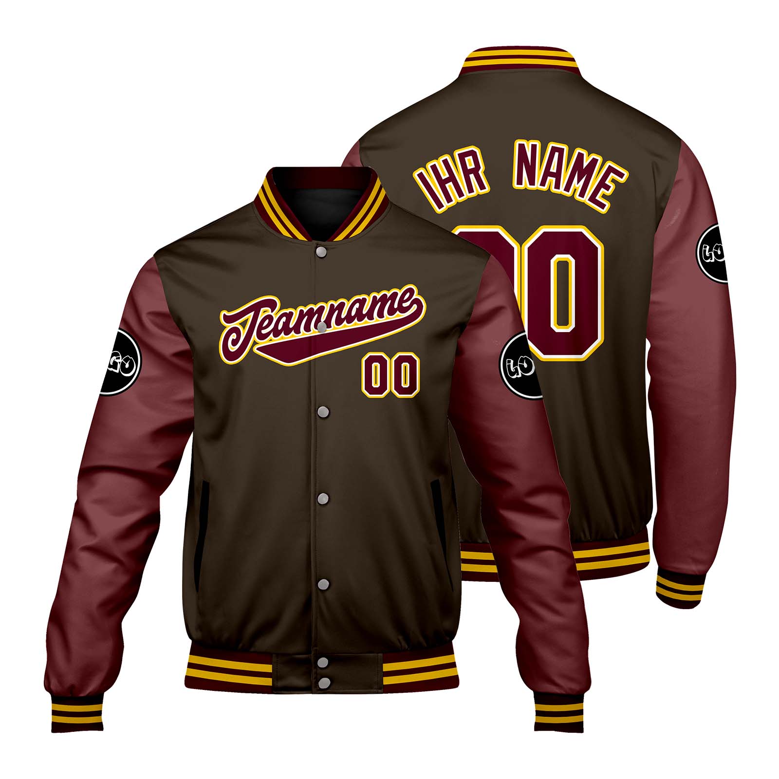 Maßgeschneiderte Braun Rot Letterman Varsity Jacket Individuelle Stickerei Druck nach Ihrem Wunsch