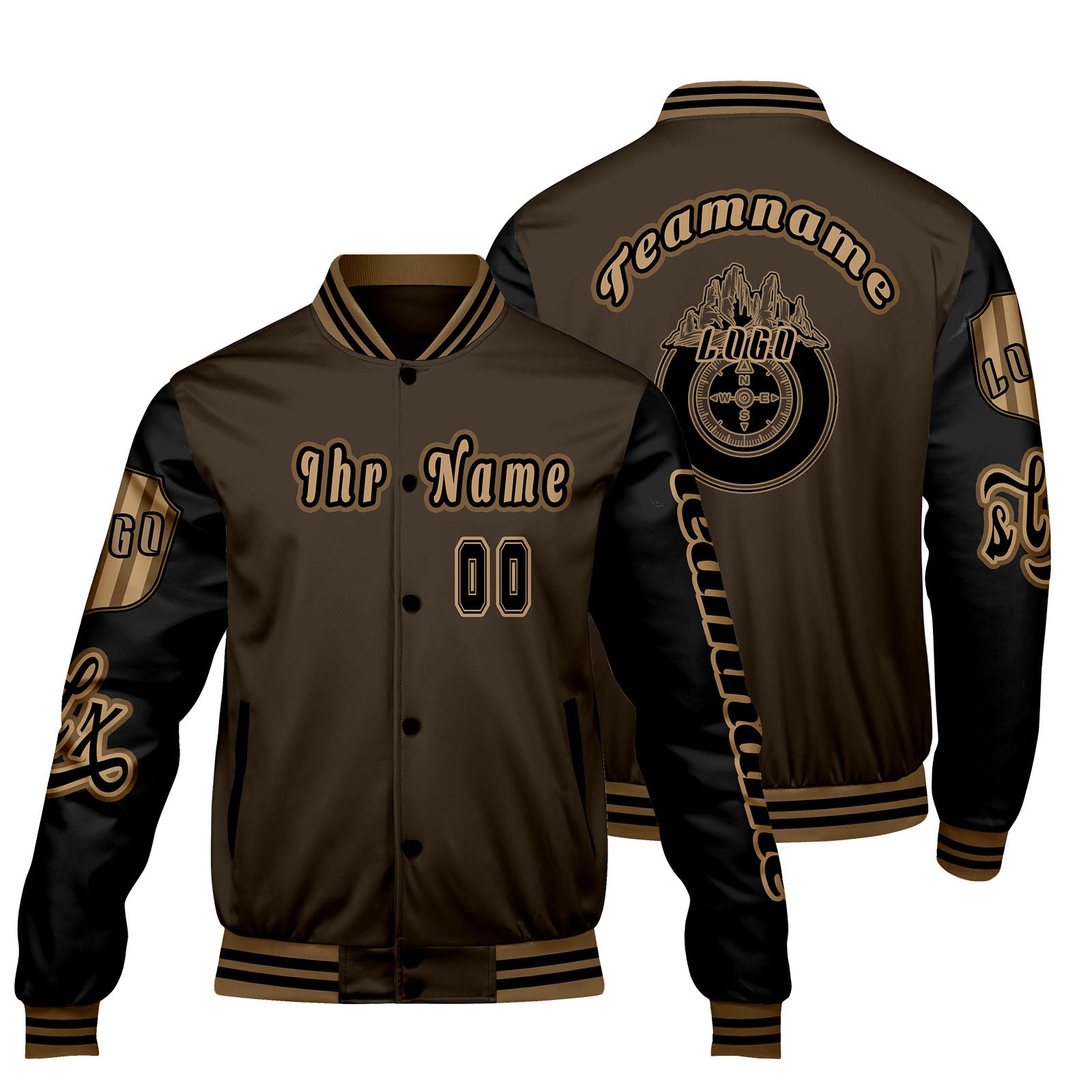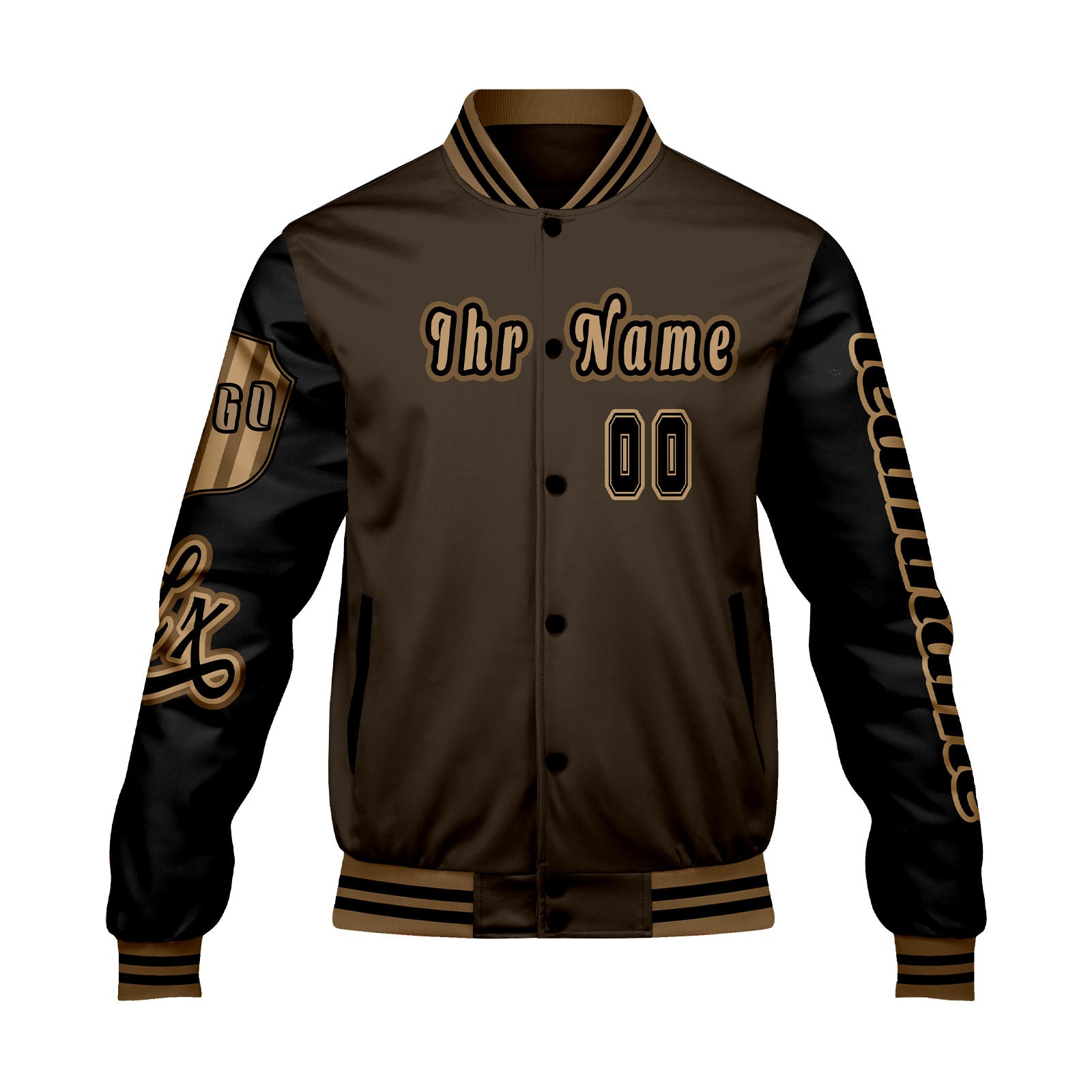 Maßgeschneiderte Braun Schwarz Letterman Varsity Jacket Individuelle Stickerei Druck nach Ihrem Wunsch