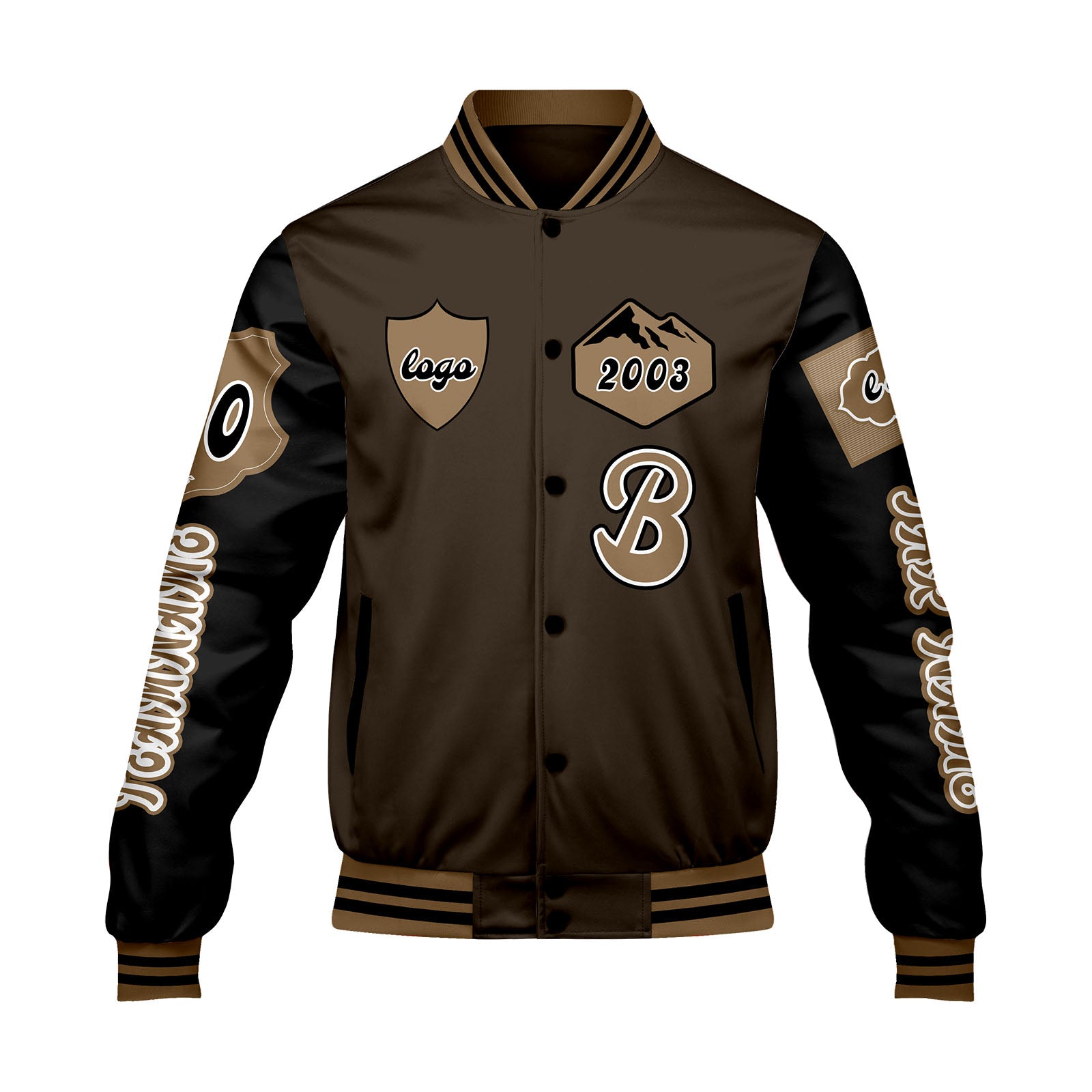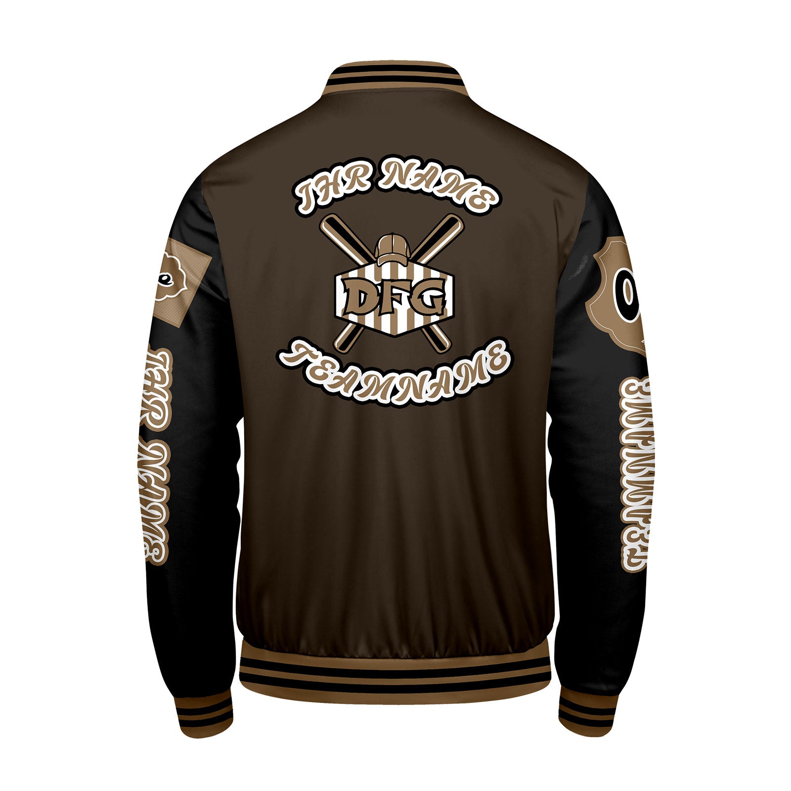 Maßgeschneiderte Braun Schwarz Letterman Varsity Jacket Individuelle Stickerei Druck nach Ihrem Wunsch
