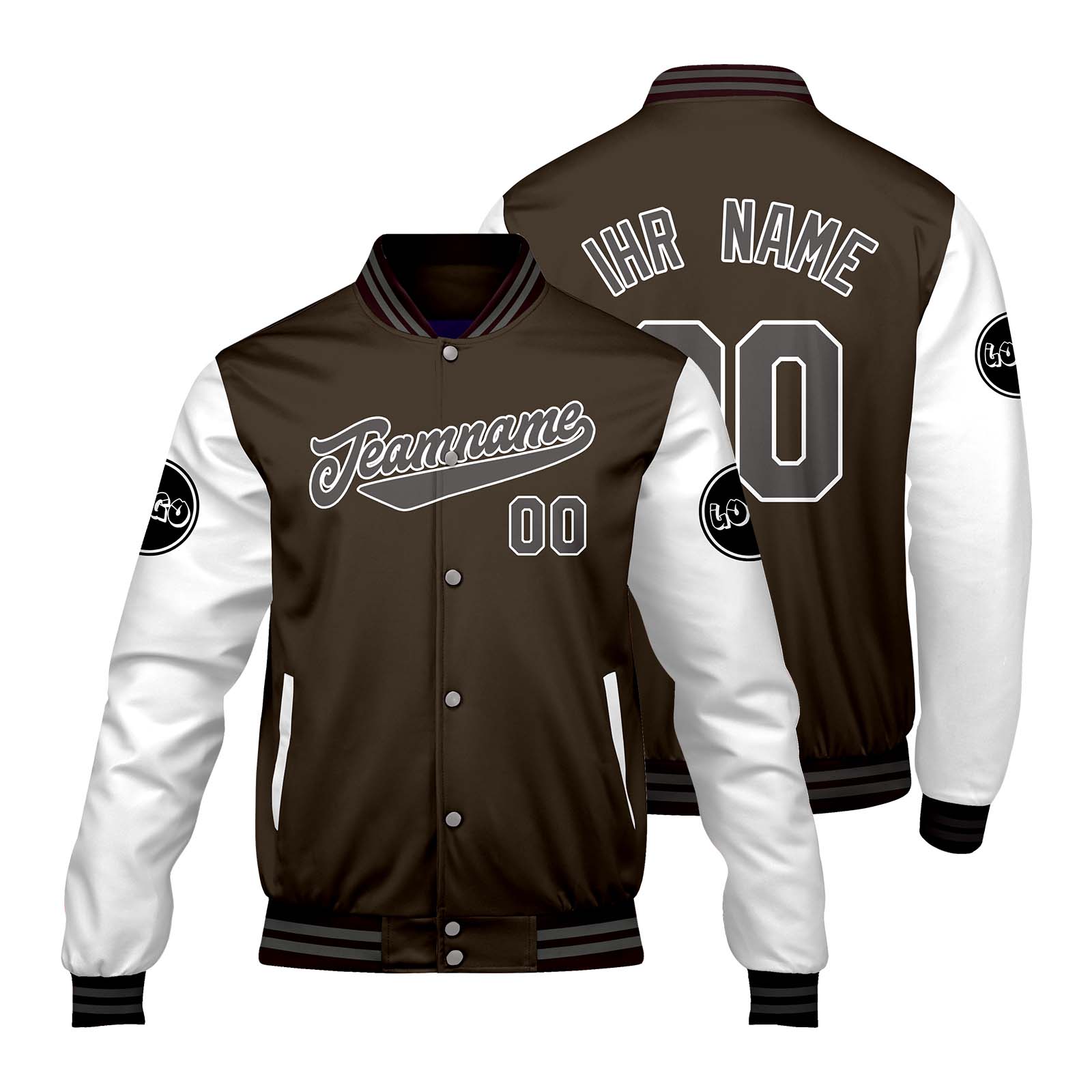 Maßgeschneiderte Braun Weiß Letterman Varsity Jacket Individuelle Stickerei Druck nach Ihrem Wunsch