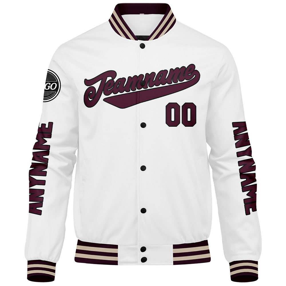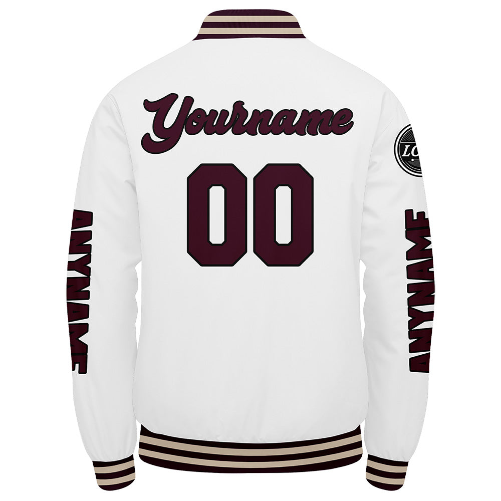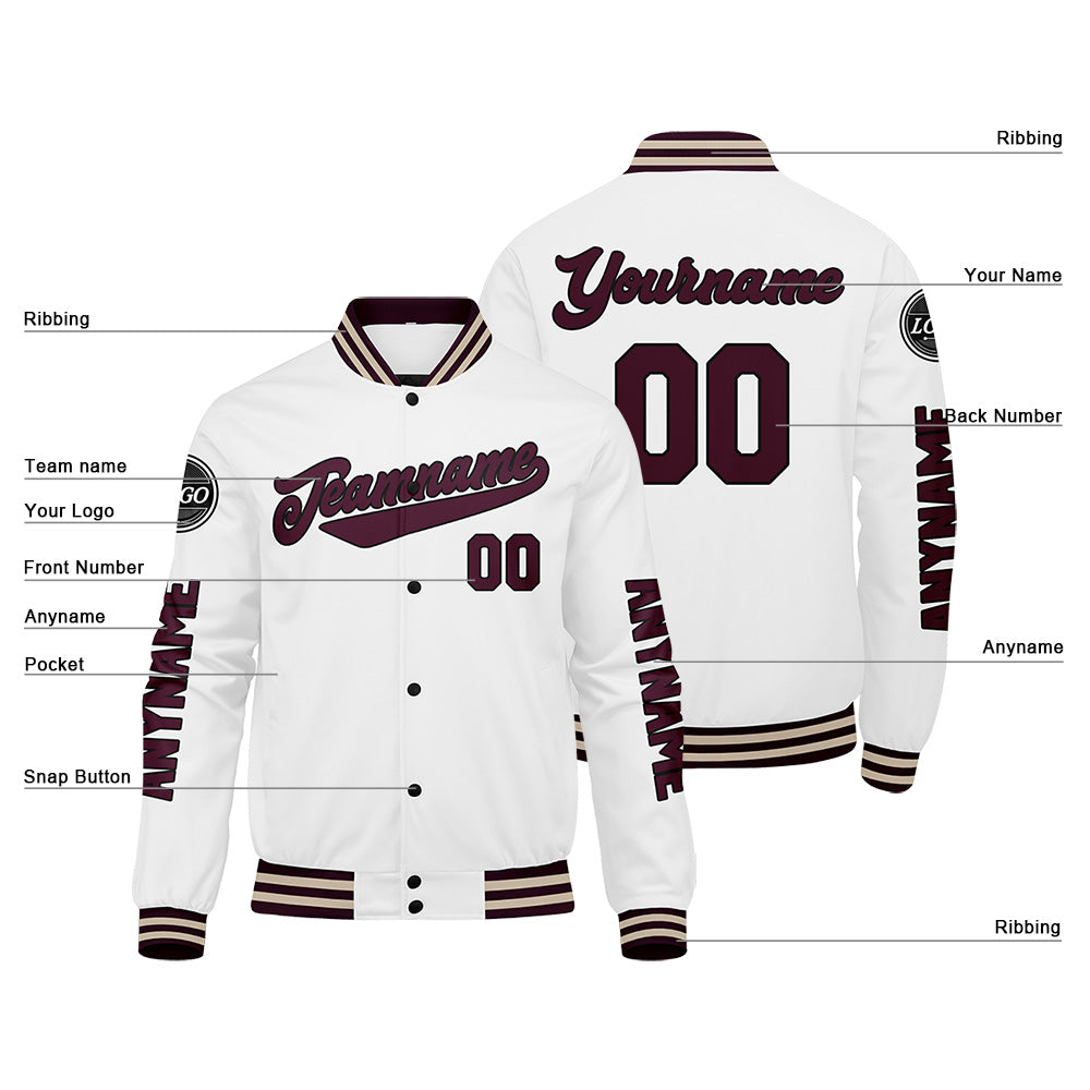 Maßgeschneiderte Braun Weiß Letterman Varsity Jacket Individuelle Stickerei Druck nach Ihrem Wunsch