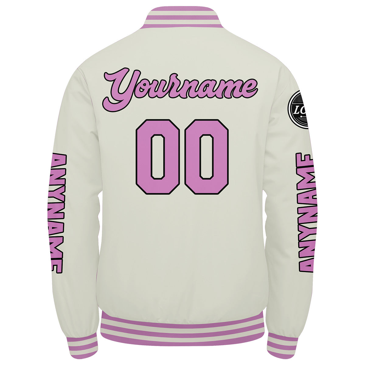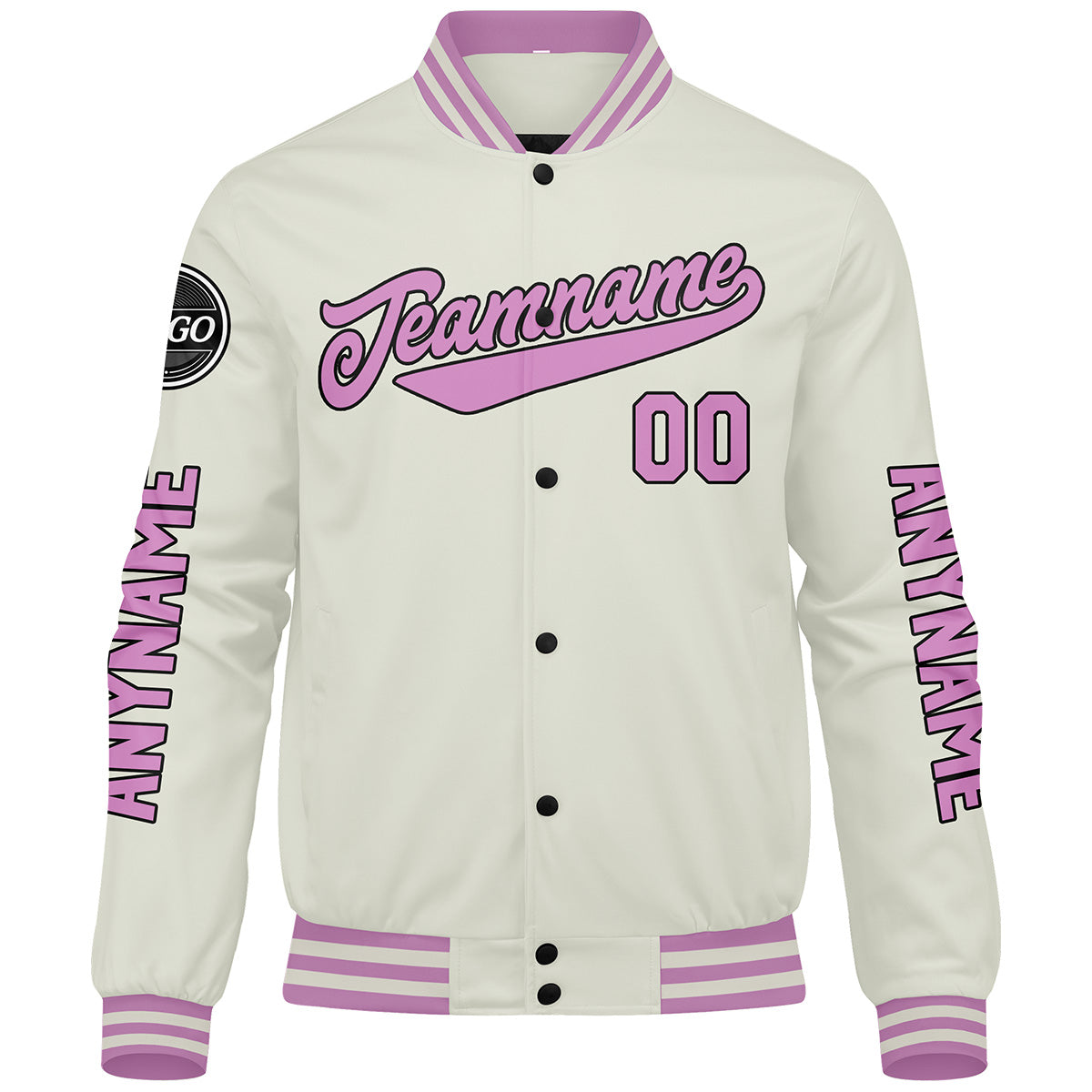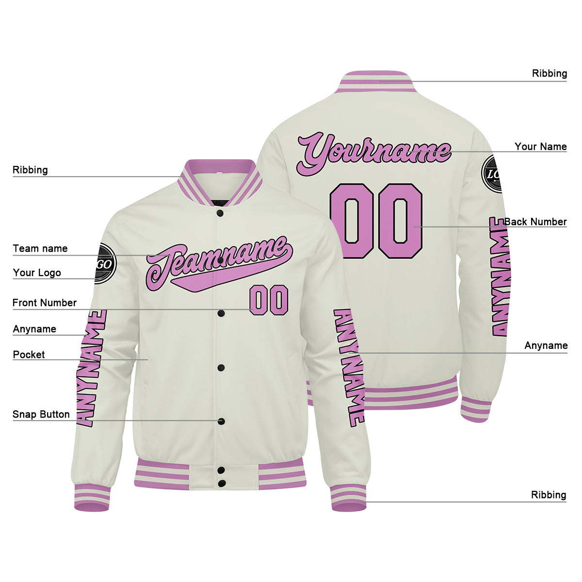 Maßgeschneiderte Creme Rosa Letterman Varsity Jacket Individuelle Stickerei Druck nach Ihrem Wunsch