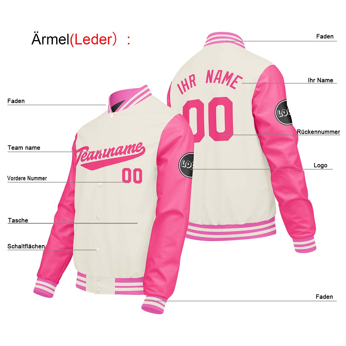 Maßgeschneiderte Creme Weiß Rosa Letterman Varsity Jacket Individuelle Stickerei Druck nach Ihrem Wunsch