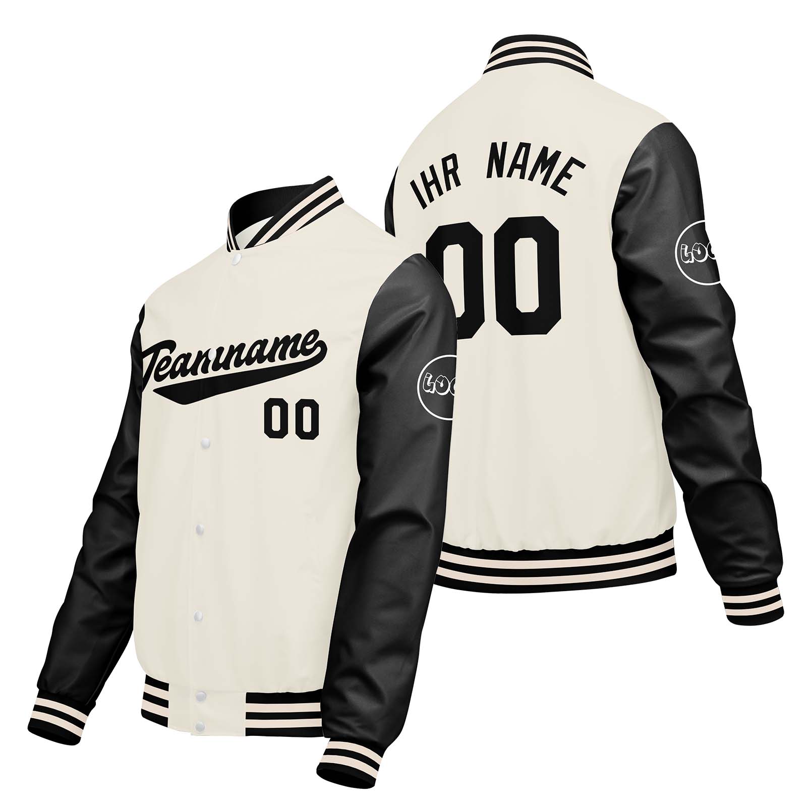 Maßgeschneiderte Creme Weiß Schwarz Letterman Varsity Jacket Individuelle Stickerei Druck nach Ihrem Wunsch