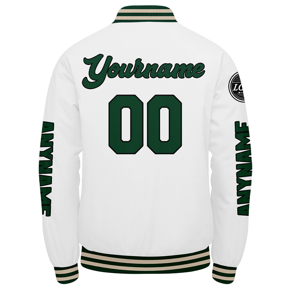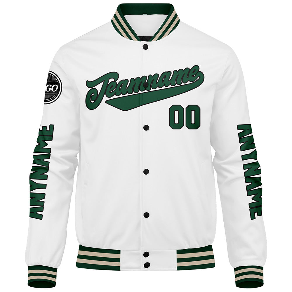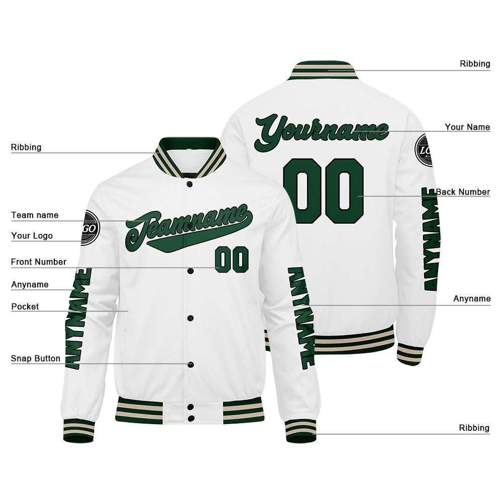 Maßgeschneiderte Dunkelgrün Weiß Creme Letterman Varsity Jacket Individuelle Stickerei Druck nach Ihrem Wunsch