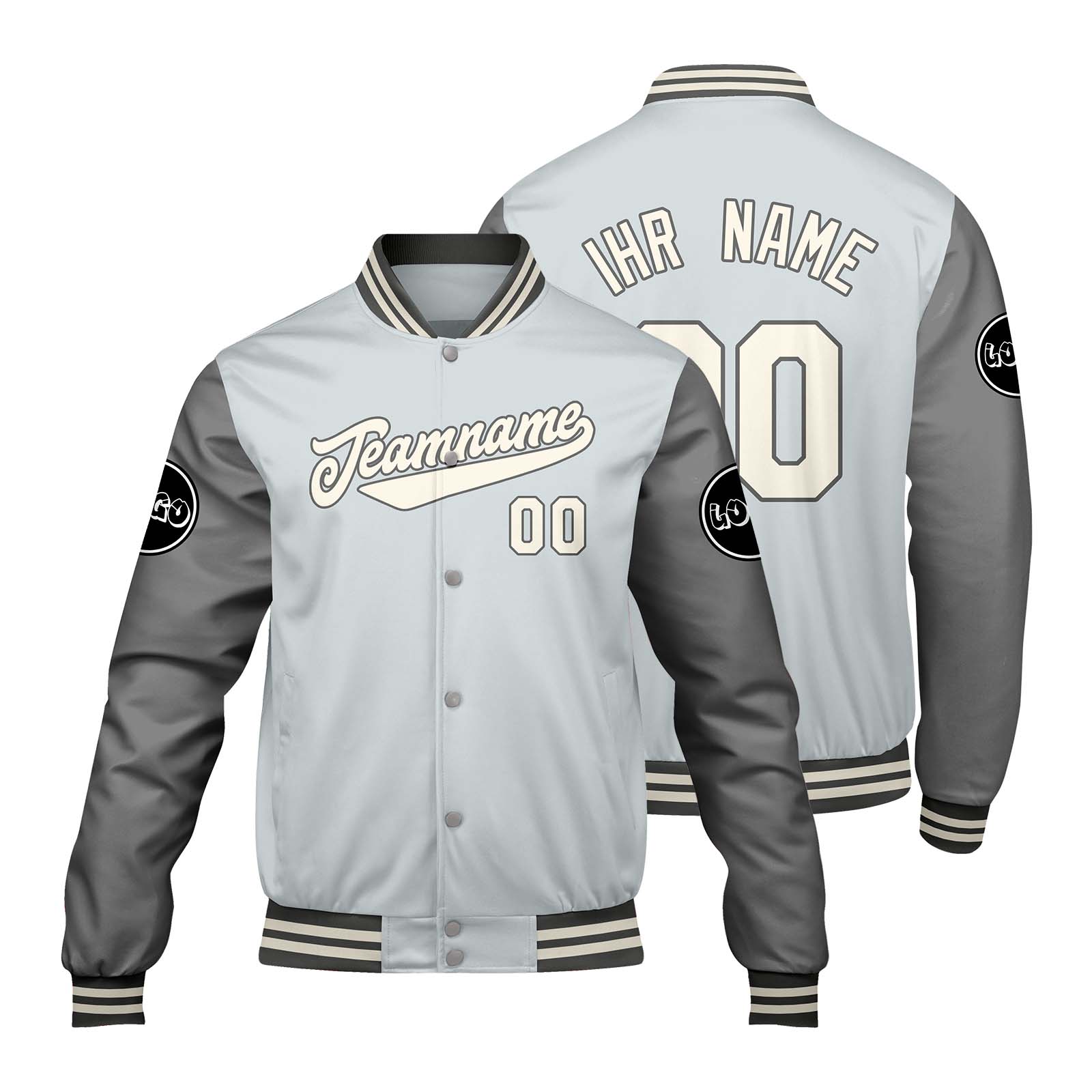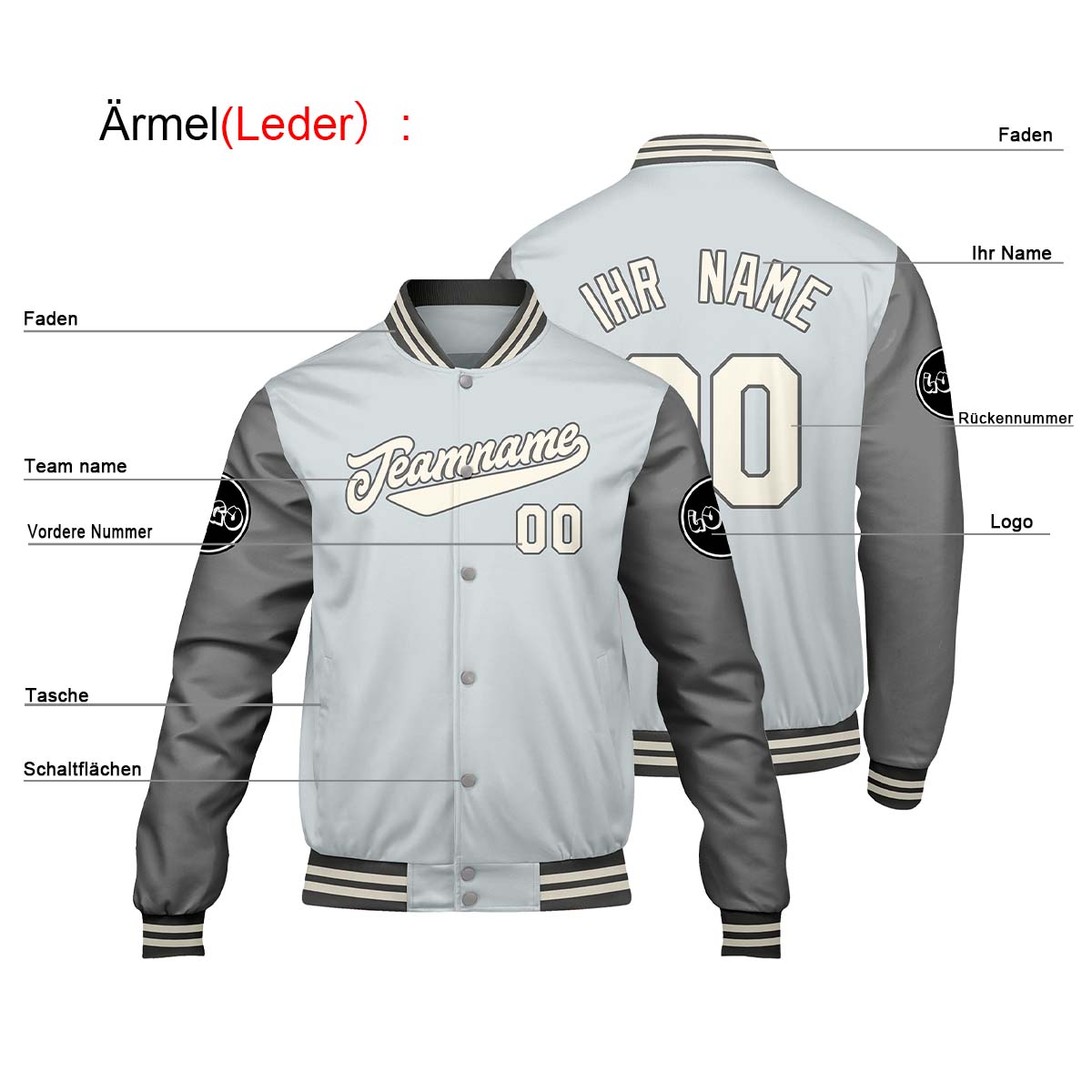 Maßgeschneiderte Grau Letterman Varsity Jacket Individuelle Stickerei Druck nach Ihrem Wunsch