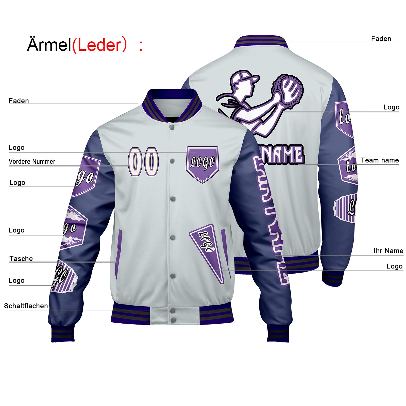 Maßgeschneiderte Grau Lila Letterman Varsity Jacket Individuelle Stickerei Druck nach Ihrem Wunsch