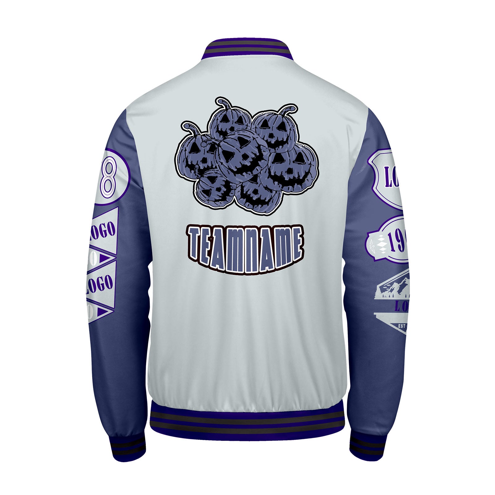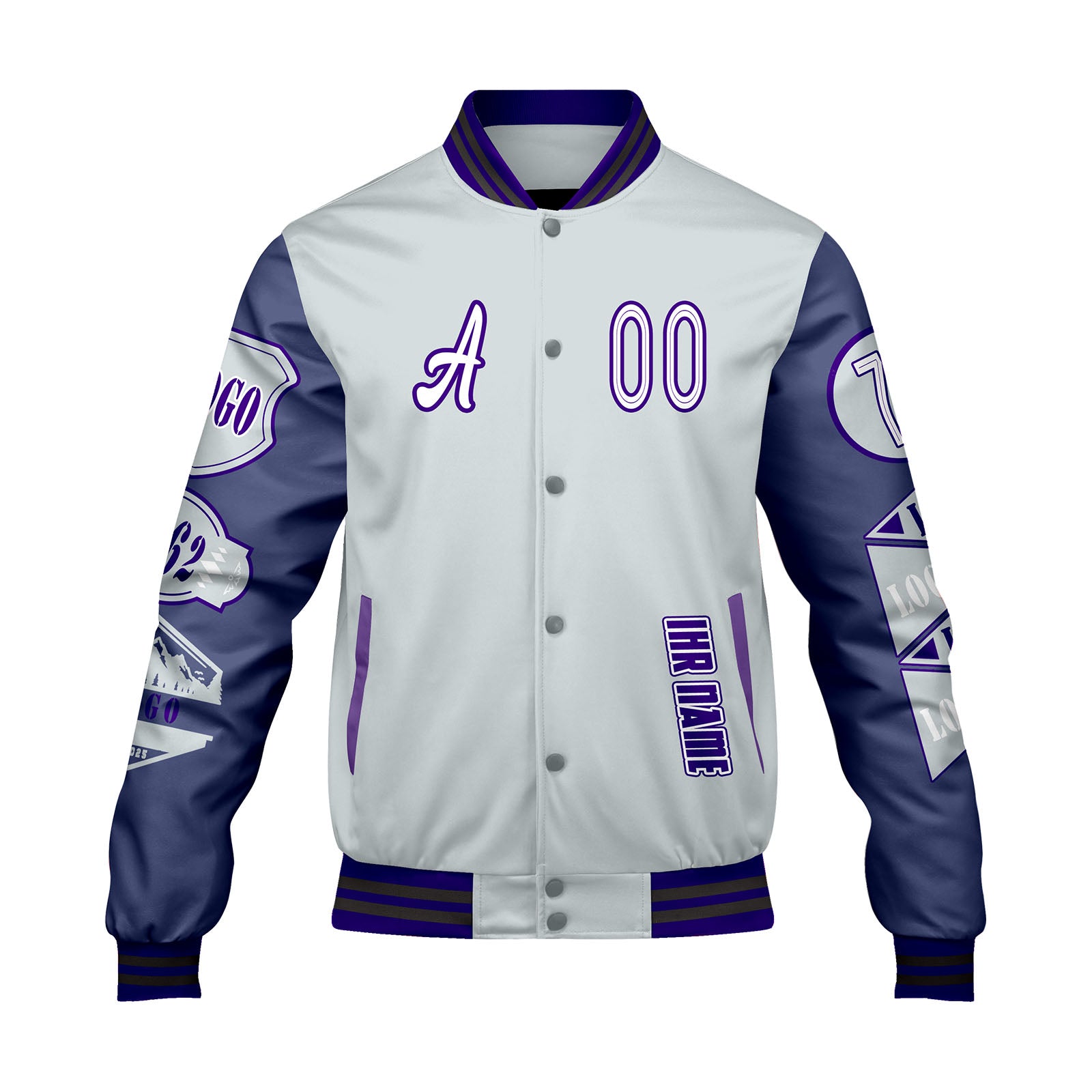 Maßgeschneiderte Grau Lila Letterman Varsity Jacket Individuelle Stickerei  Druck nach Ihrem Wunsch
