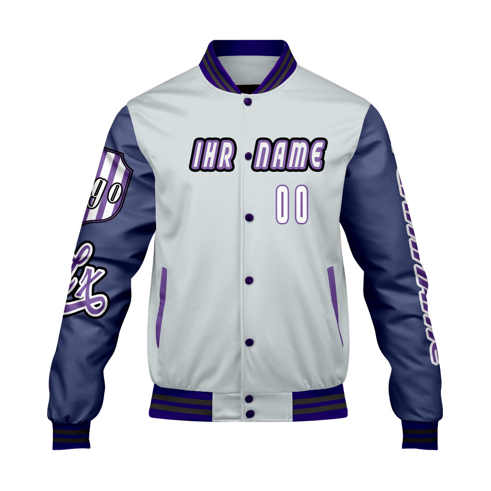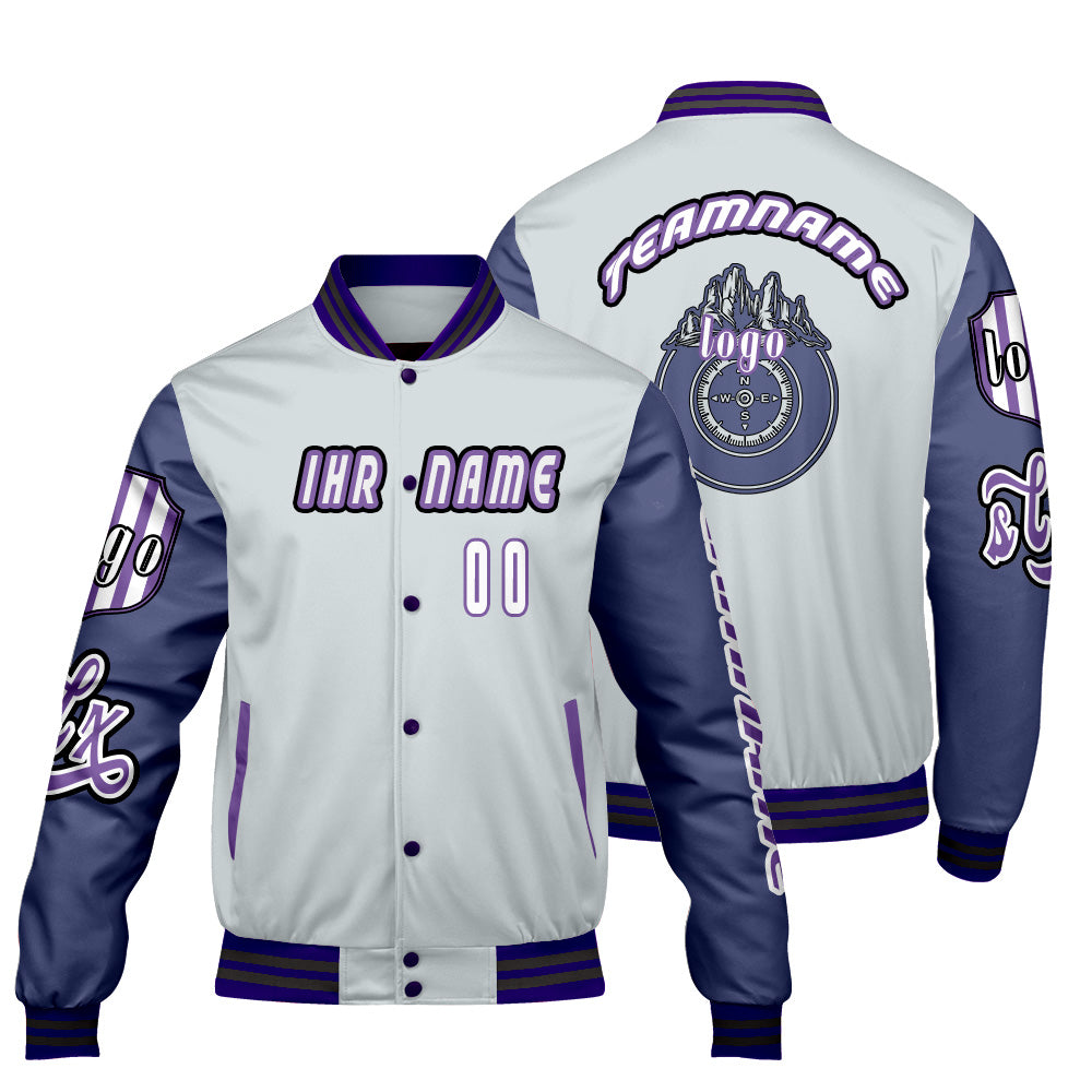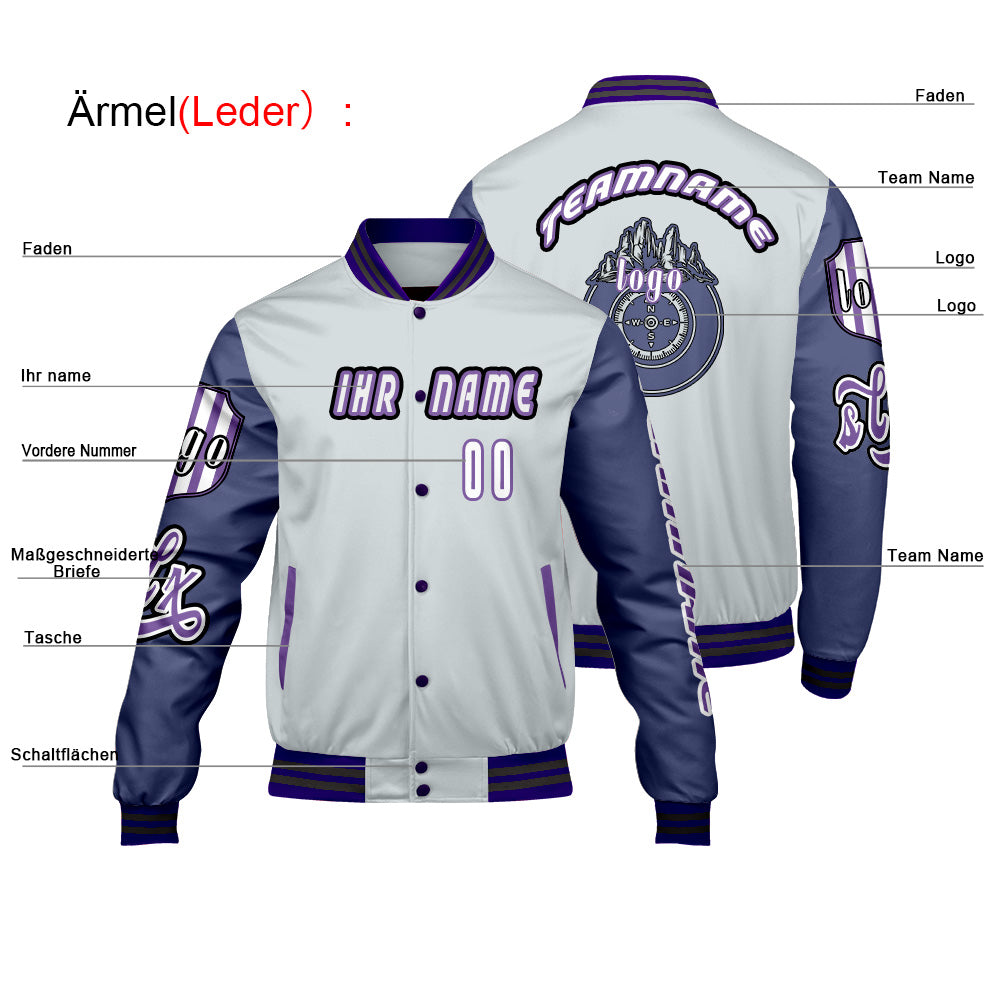 Maßgeschneiderte Grau Lila Letterman Varsity Jacket Individuelle Stickerei  Druck nach Ihrem Wunsch