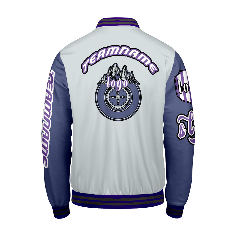 Maßgeschneiderte Grau Lila Letterman Varsity Jacket Individuelle Stickerei Druck nach Ihrem Wunsch