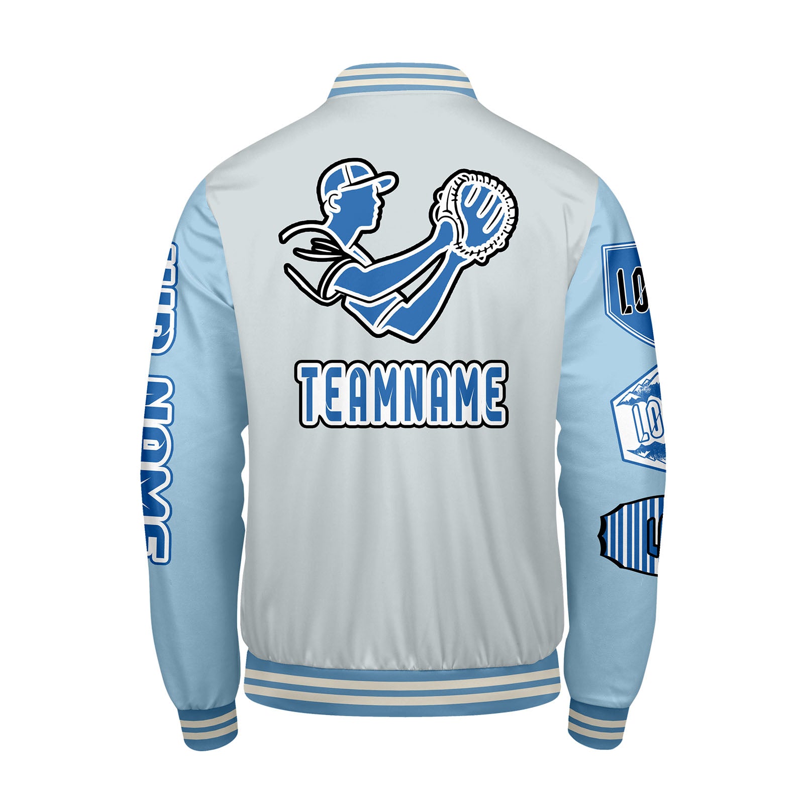 Maßgeschneiderte Grau Löwenblau Letterman Varsity Jacket Individuelle Stickerei  Druck nach Ihrem Wunsch