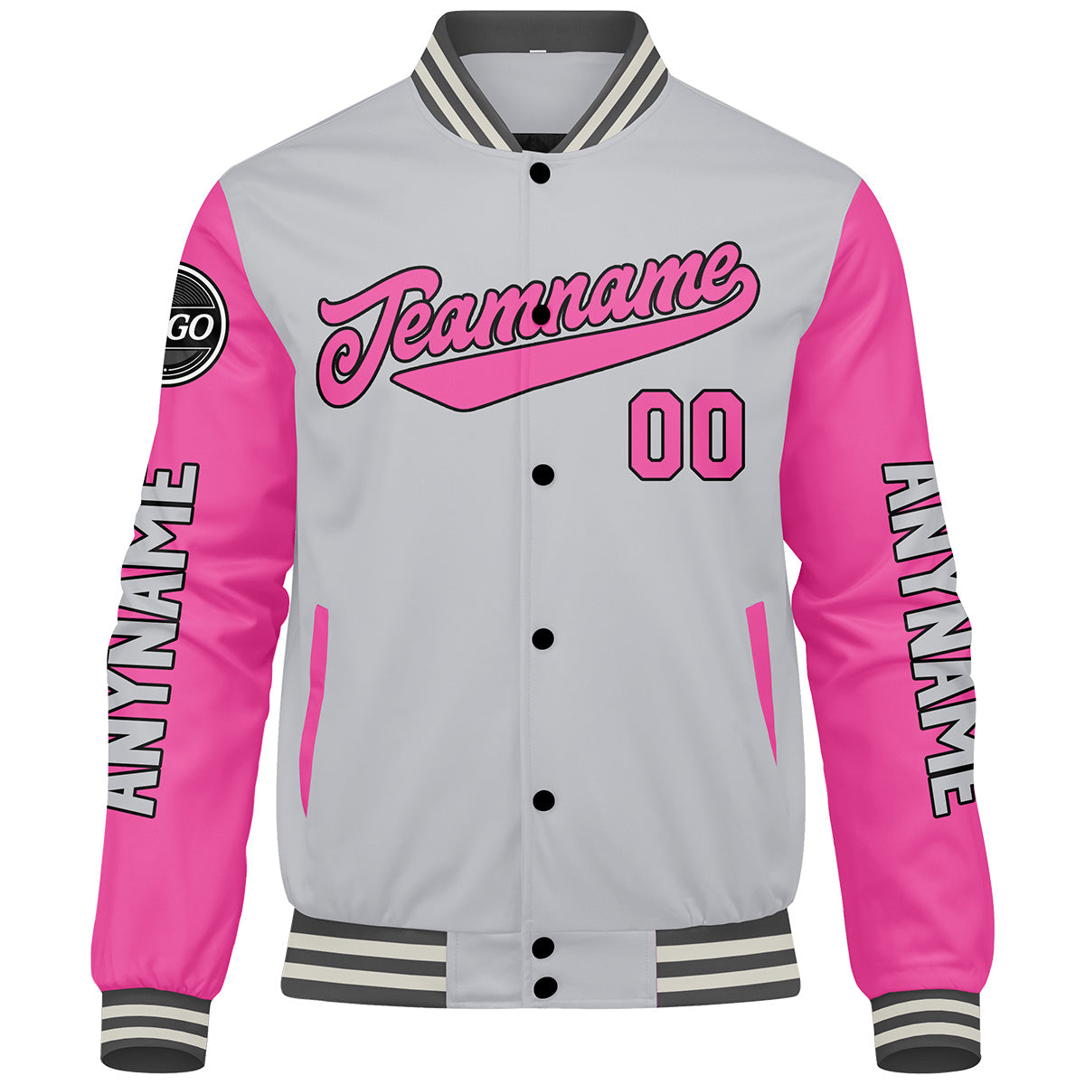 Maßgeschneiderte Grau Rosa Letterman Varsity Jacket Individuelle Stickerei Druck nach Ihrem Wunsch