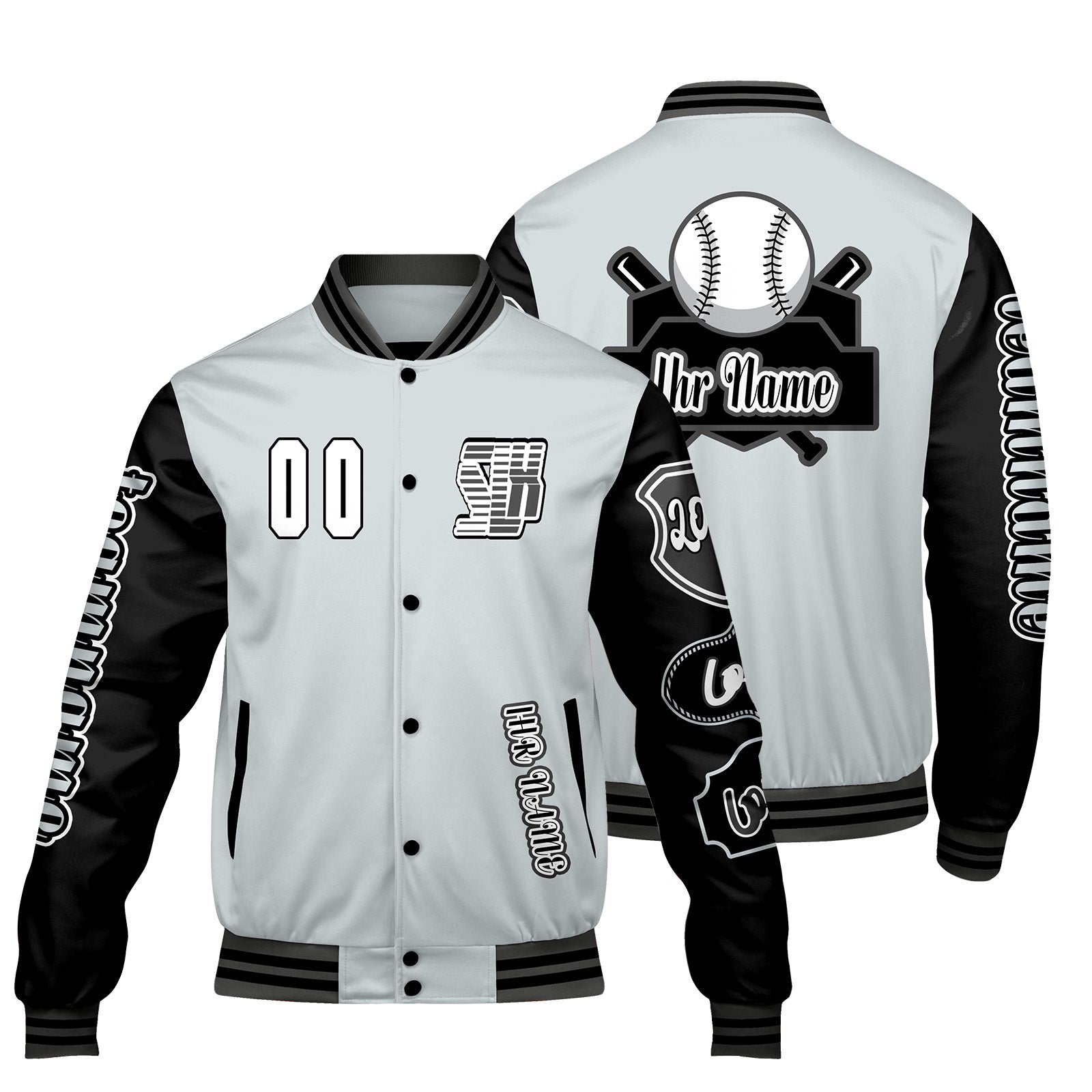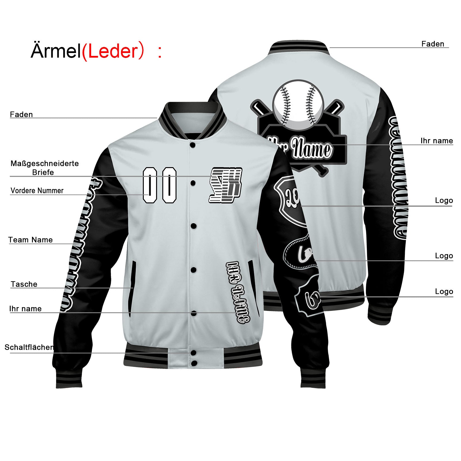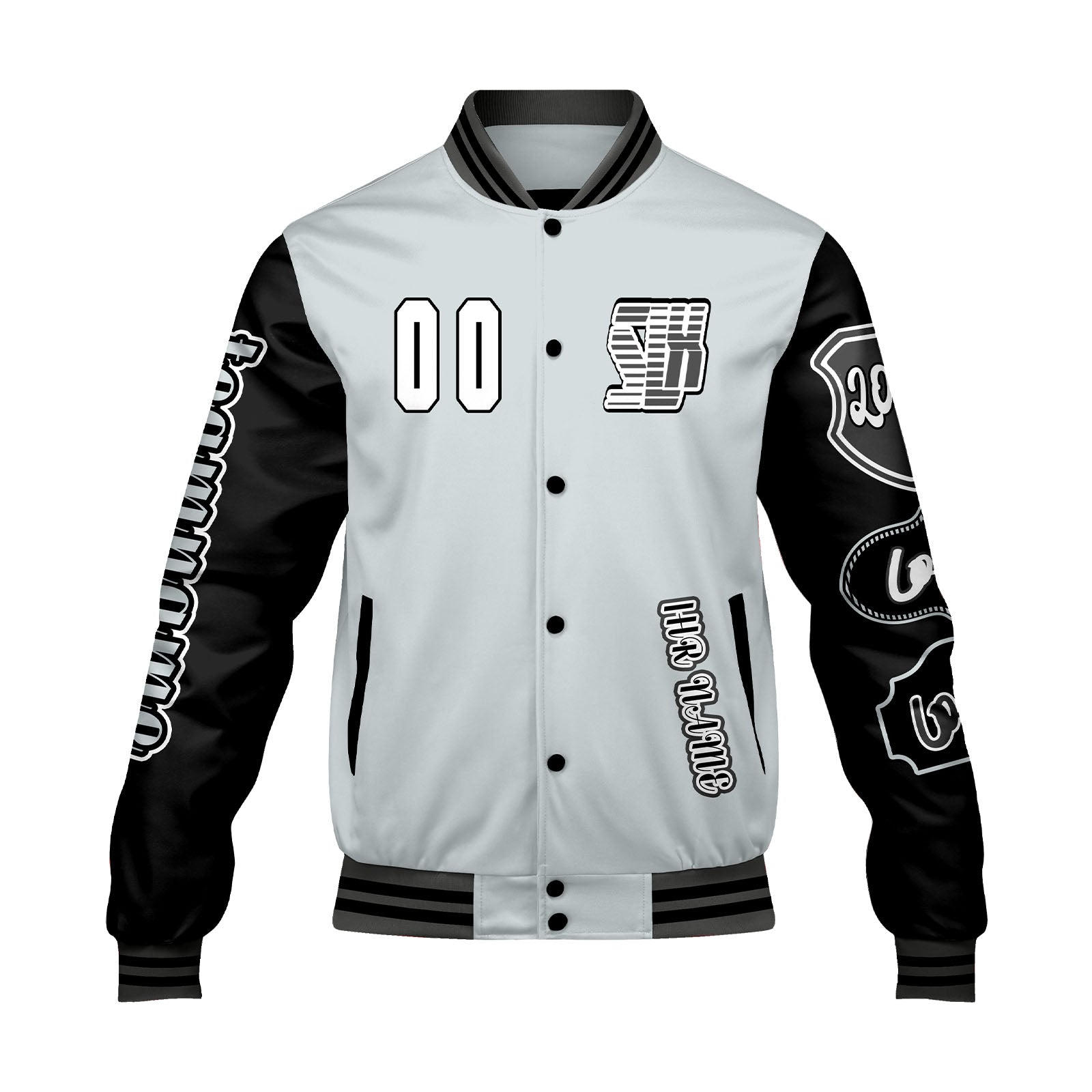 Maßgeschneiderte Grau Schwarz Letterman Varsity Jacket Individuelle Stickerei Druck nach Ihrem Wunsch