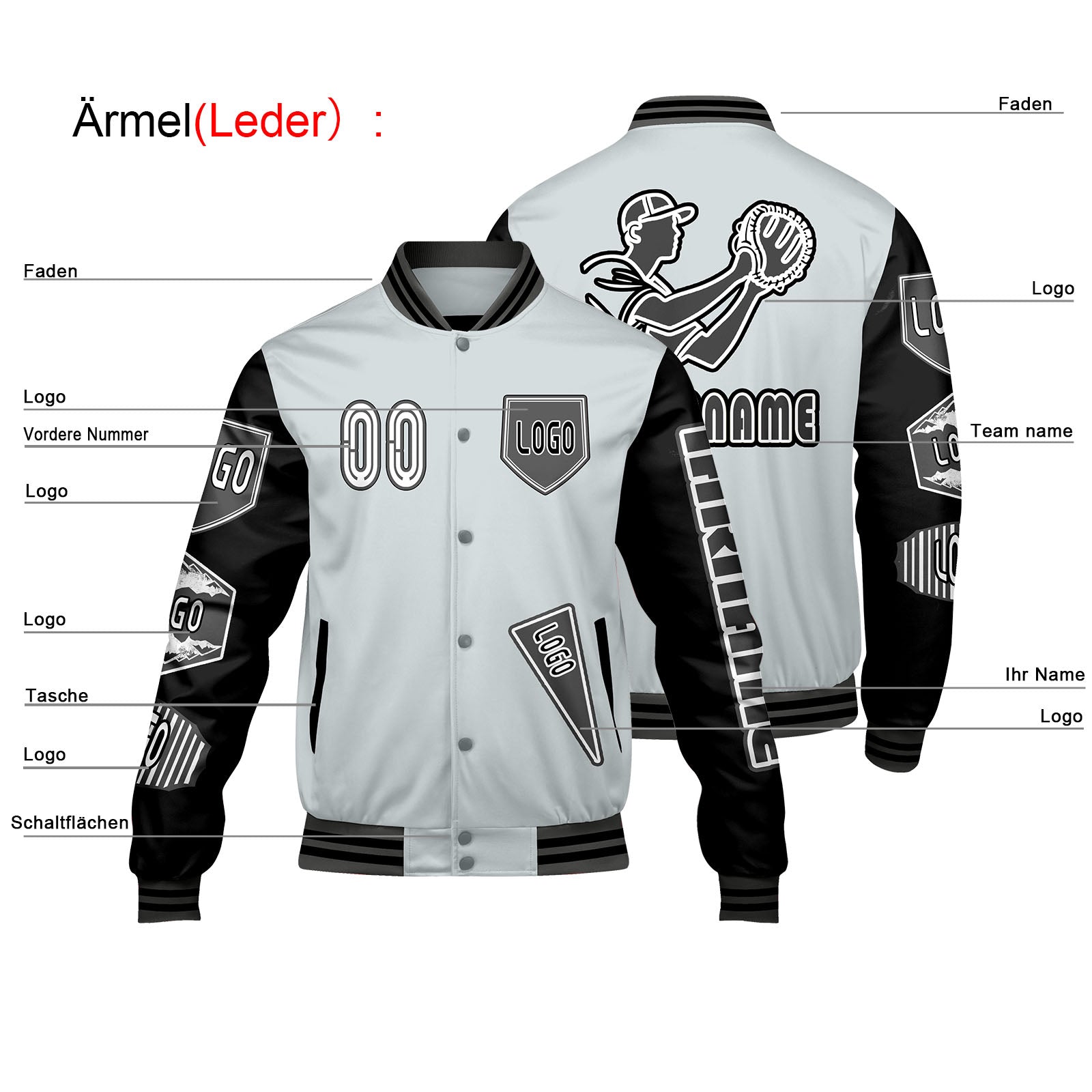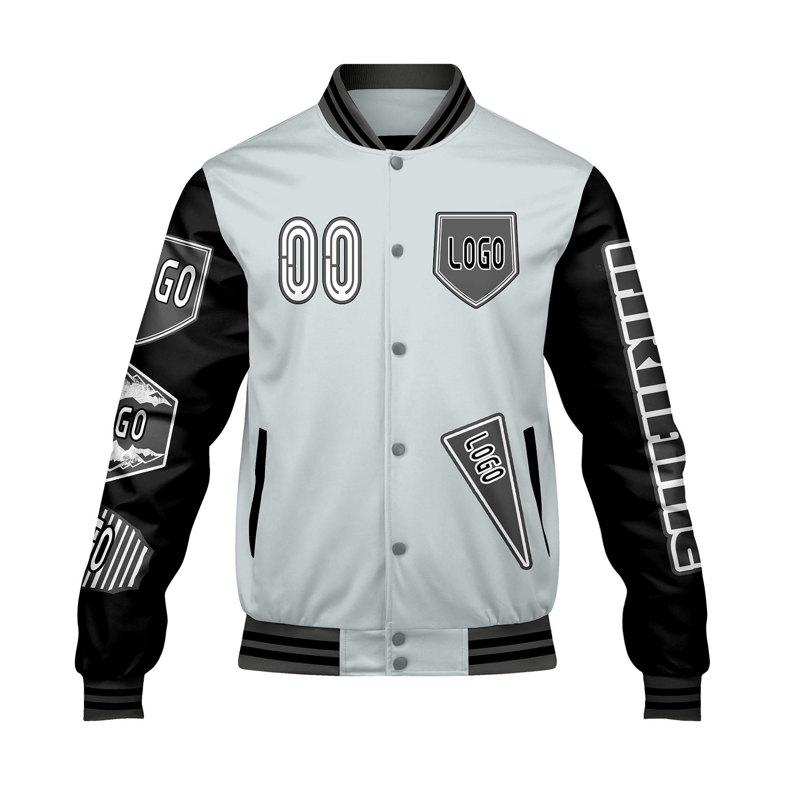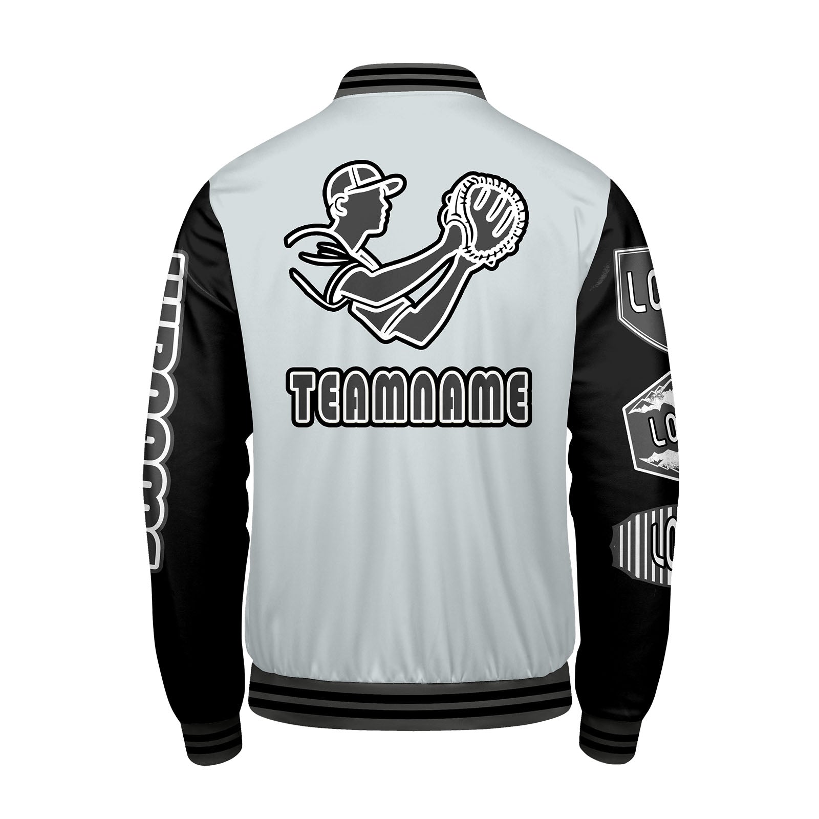 Maßgeschneiderte Grau Schwarz Letterman Varsity Jacket Individuelle Stickerei Druck nach Ihrem Wunsch