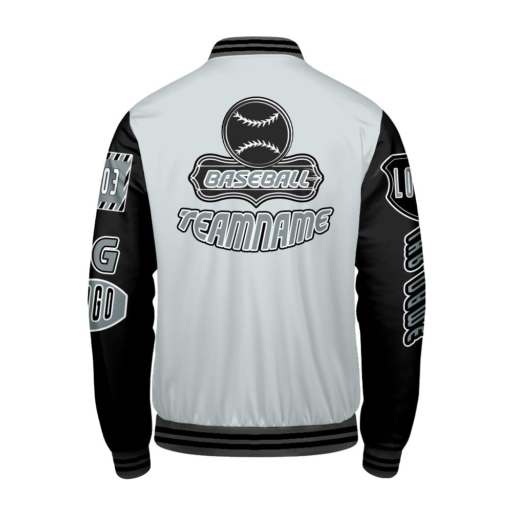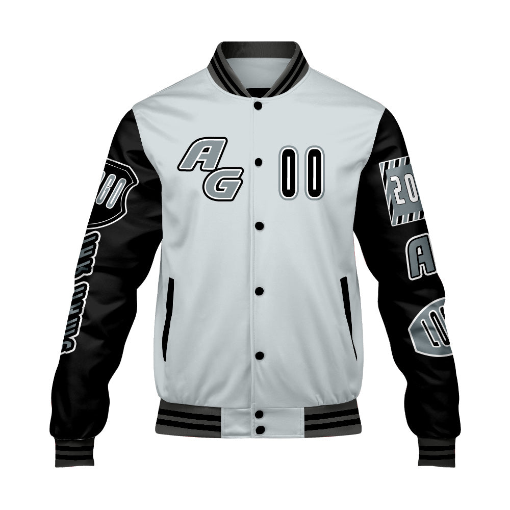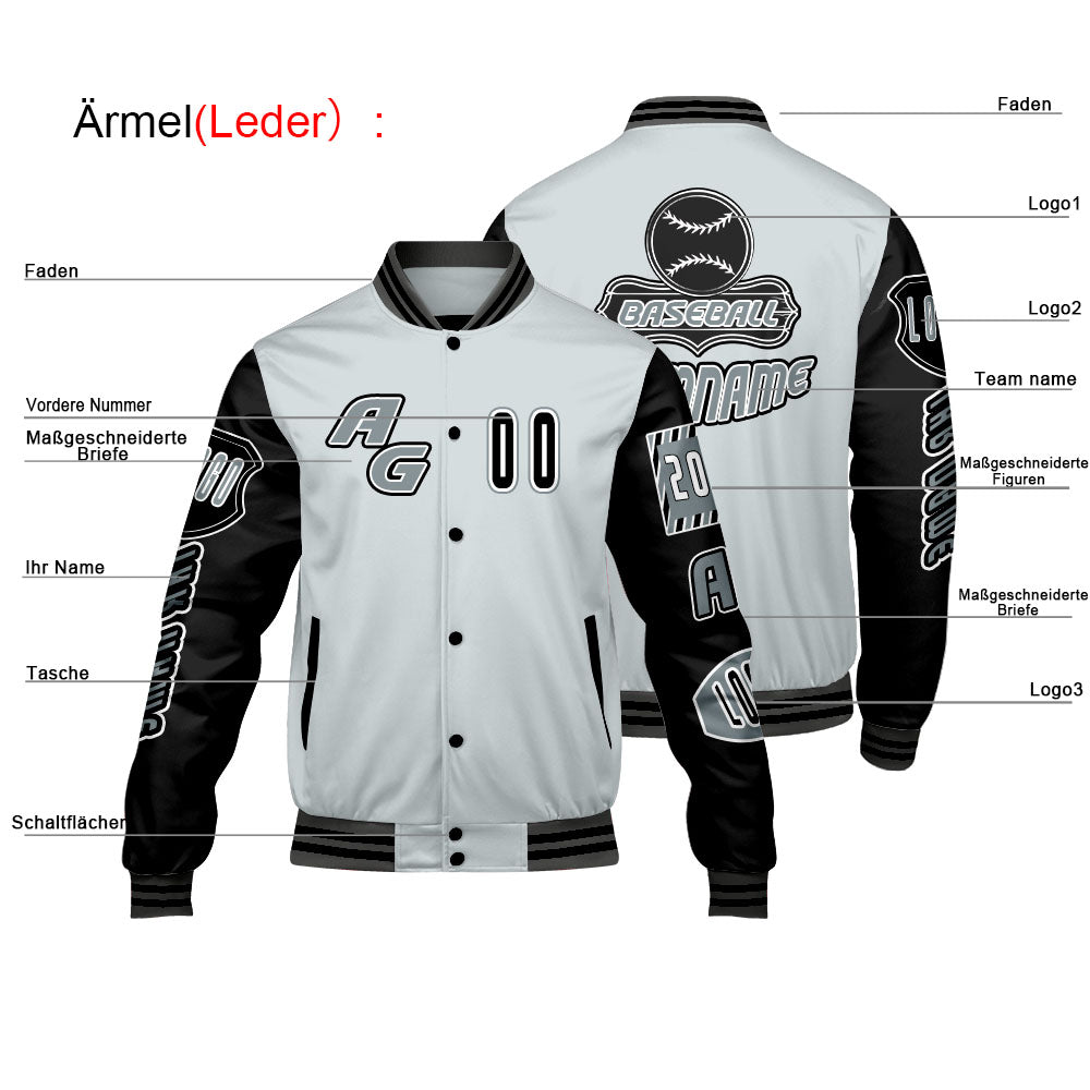 Maßgeschneiderte Grau Schwarz Letterman Varsity Jacket Individuelle Stickerei Druck nach Ihrem Wunsch