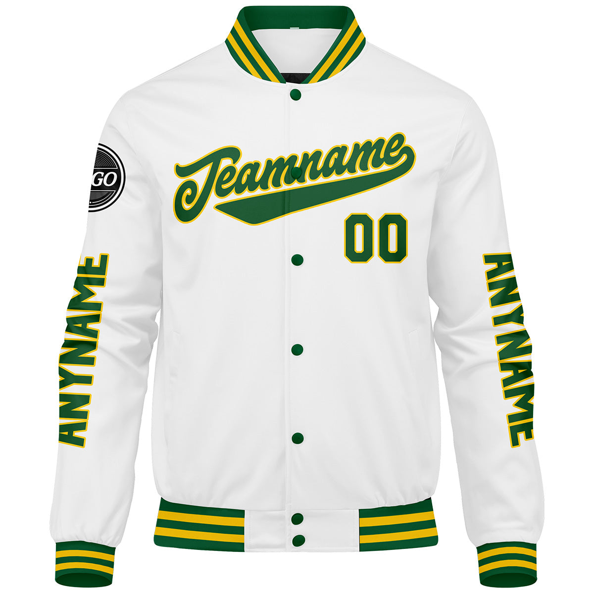 Maßgeschneiderte Grün Gelb Weiß Letterman Varsity Jacket Individuelle Stickerei Druck nach Ihrem Wunsch