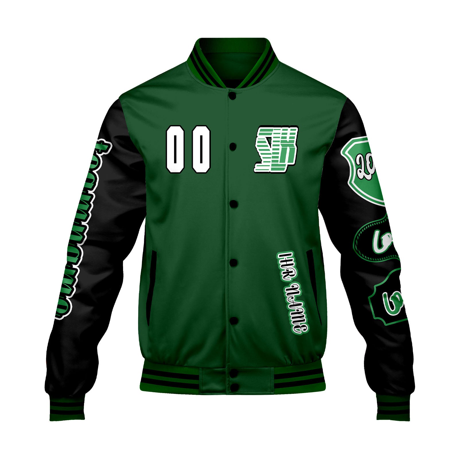 Maßgeschneiderte Grün Schwarz Letterman Varsity Jacket Individuelle Stickerei Druck nach Ihrem Wunsch