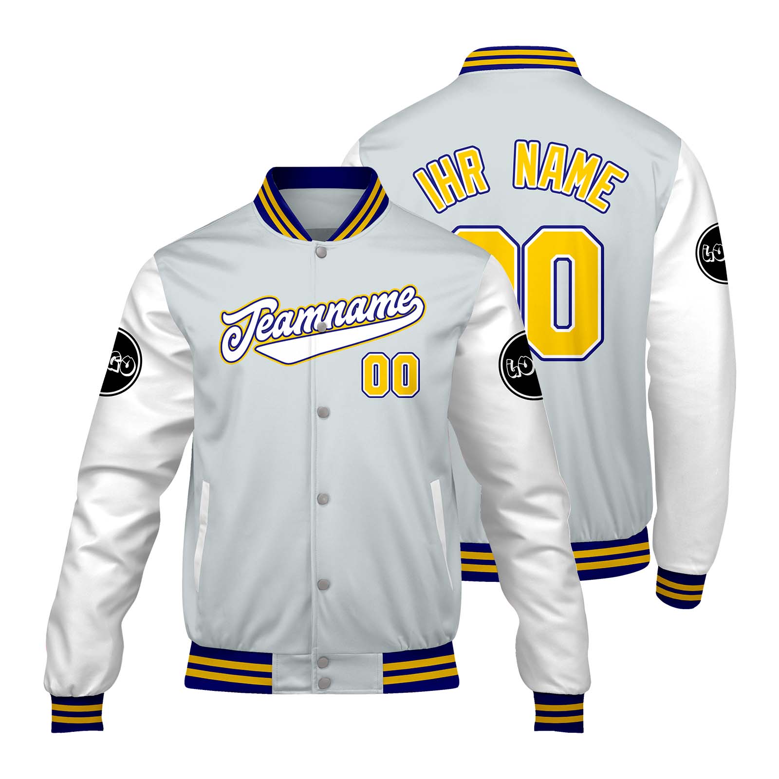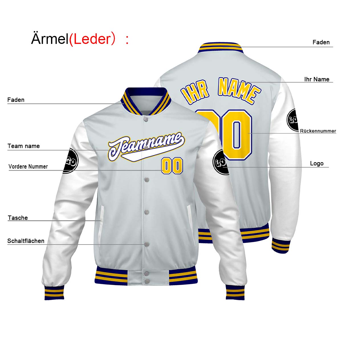Maßgeschneiderte Hellgrau Weiß Letterman Varsity Jacket Individuelle Stickerei Druck nach Ihrem Wunsch