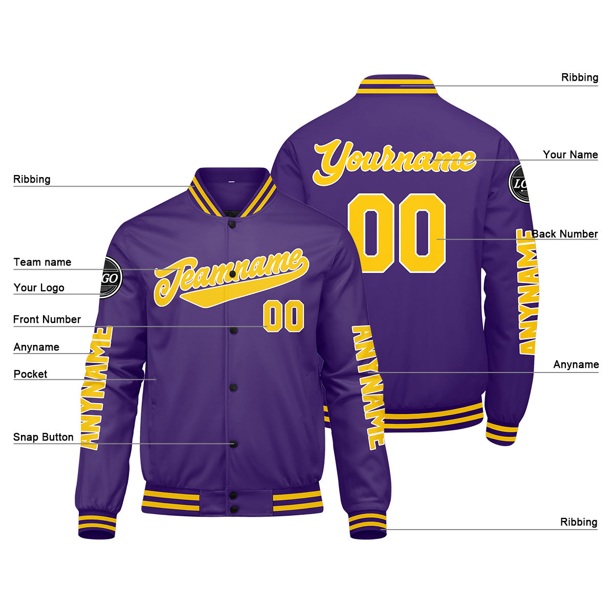 Maßgeschneiderte Lila Gelb Letterman Varsity Jacket Individuelle Stickerei Druck nach Ihrem Wunsch