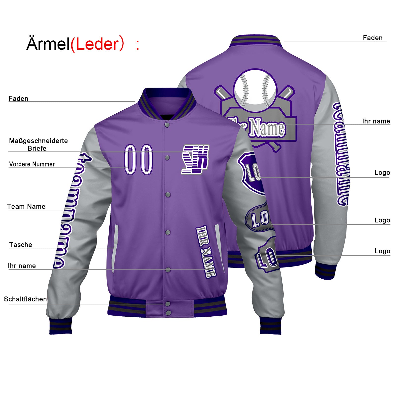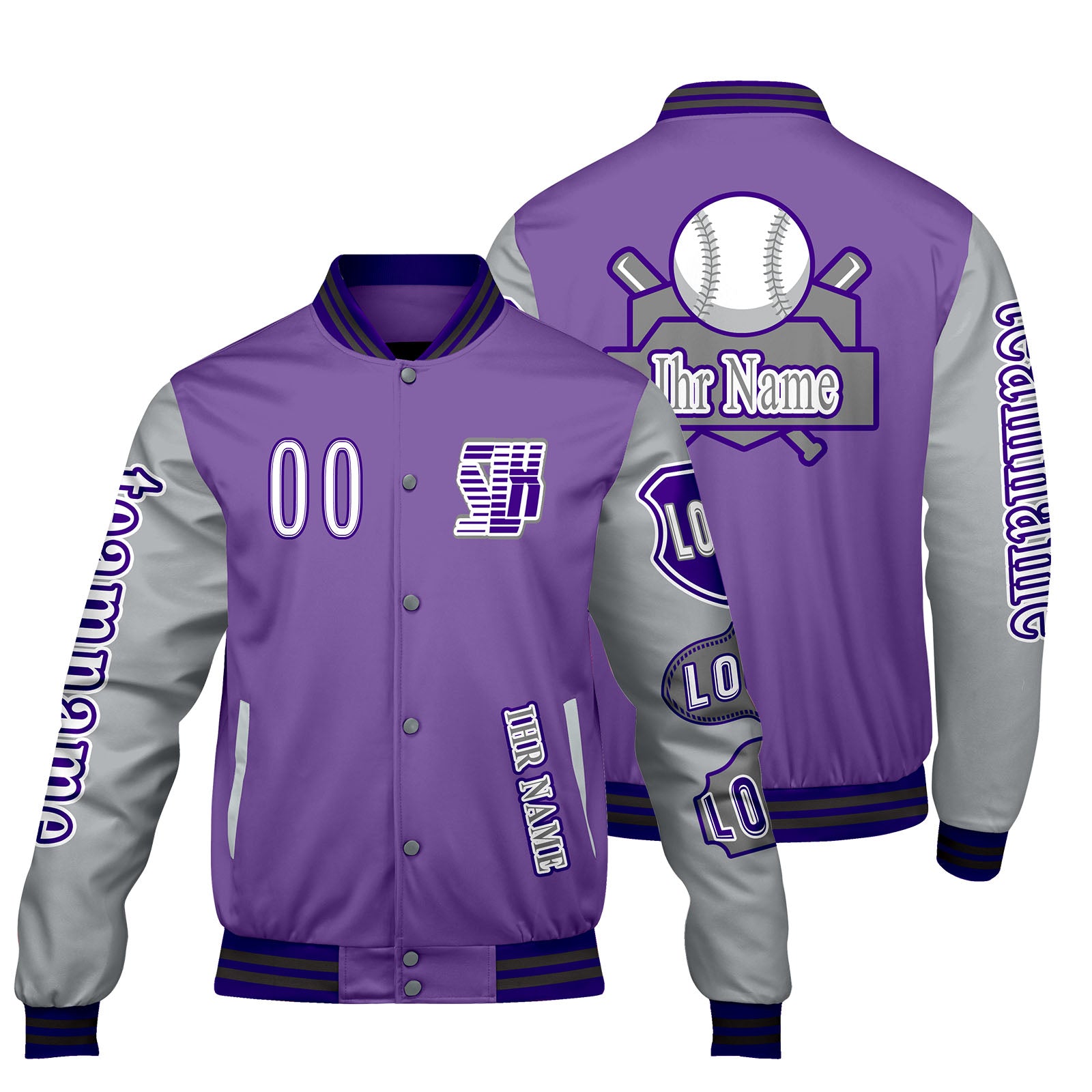 Maßgeschneiderte Lila Grau Letterman Varsity Jacket Individuelle Stickerei  Druck nach Ihrem Wunsch