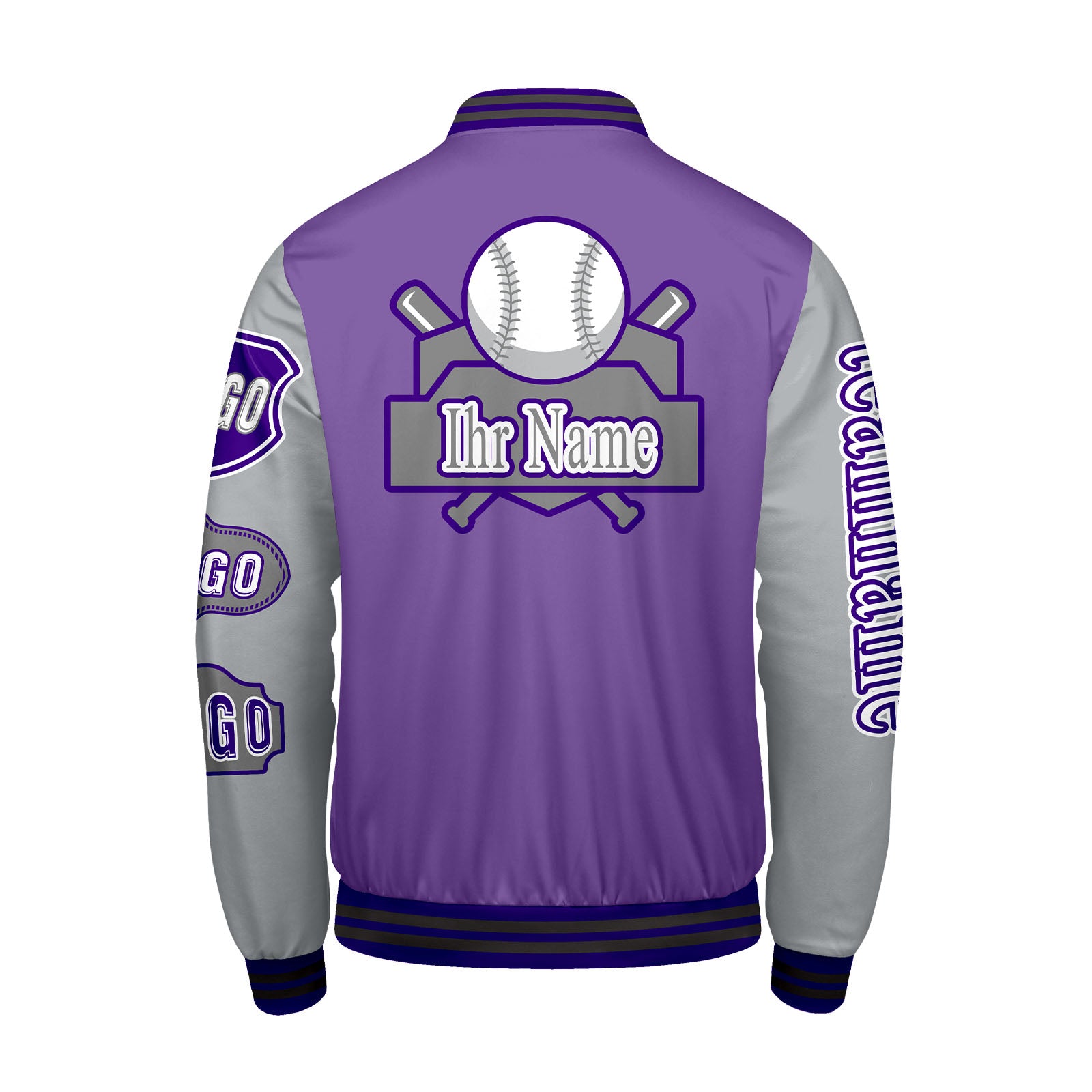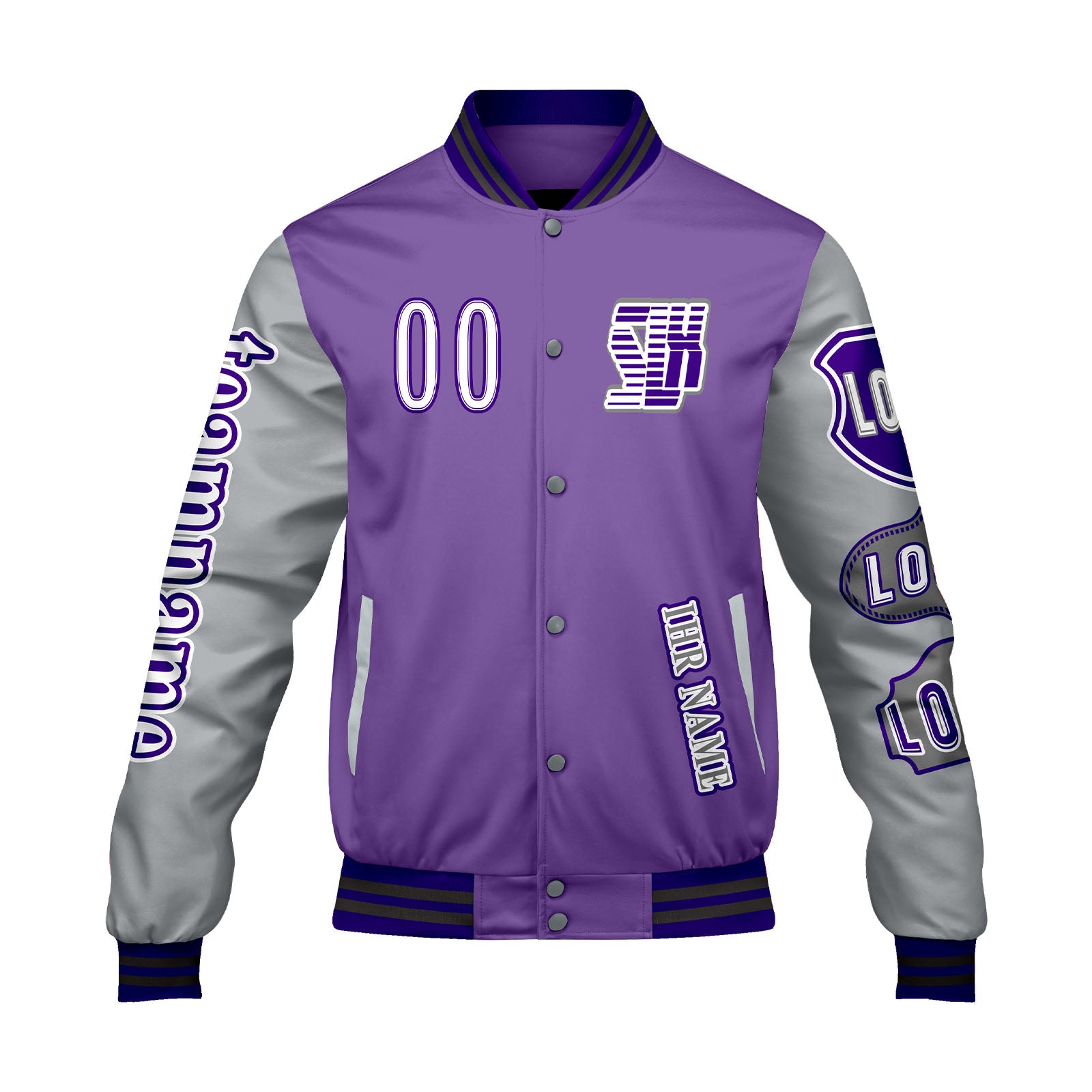Maßgeschneiderte Lila Grau Letterman Varsity Jacket Individuelle Stickerei Druck nach Ihrem Wunsch