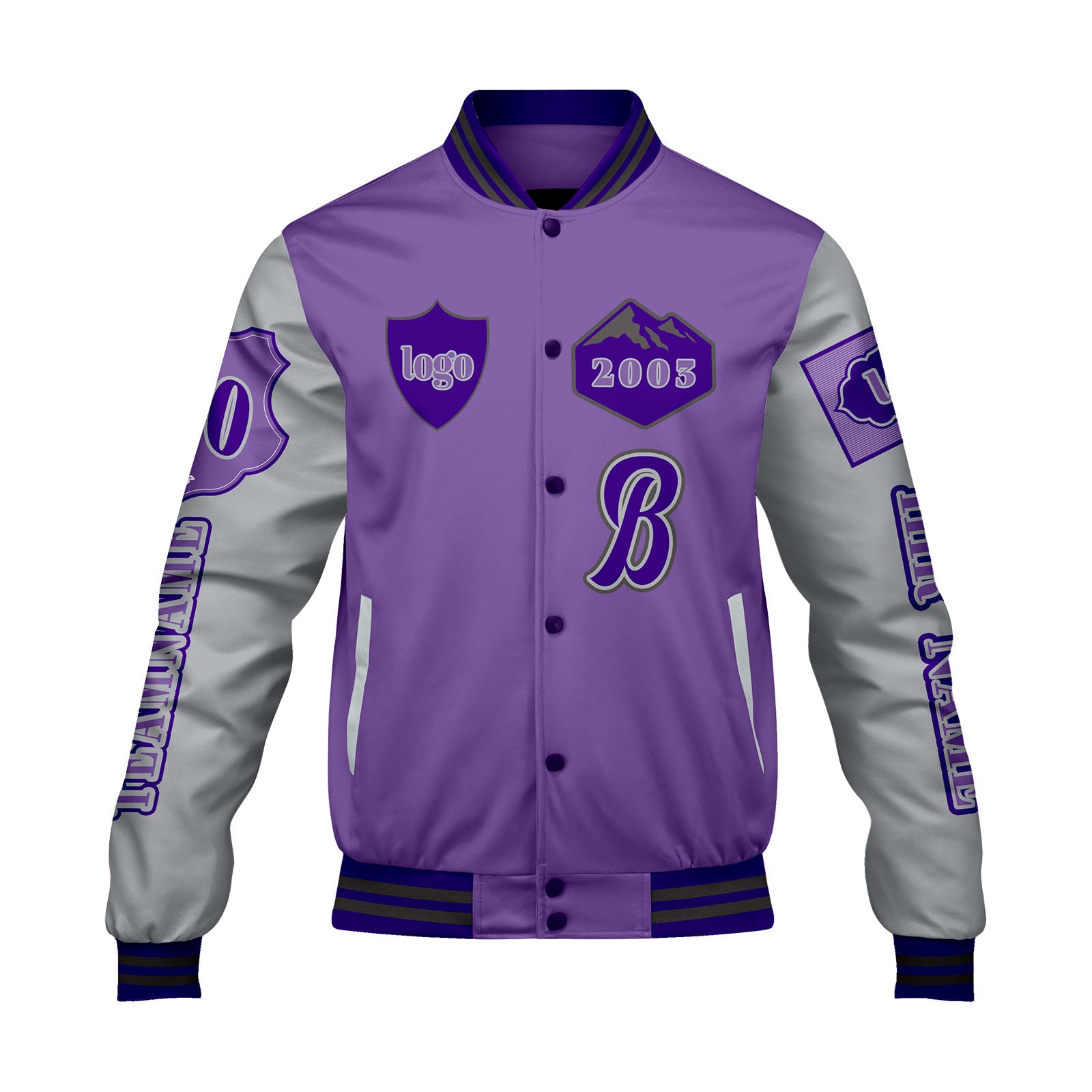 Maßgeschneiderte Lila Lichtgrau Letterman Varsity Jacket Individuelle Stickerei Druck nach Ihrem Wunsch