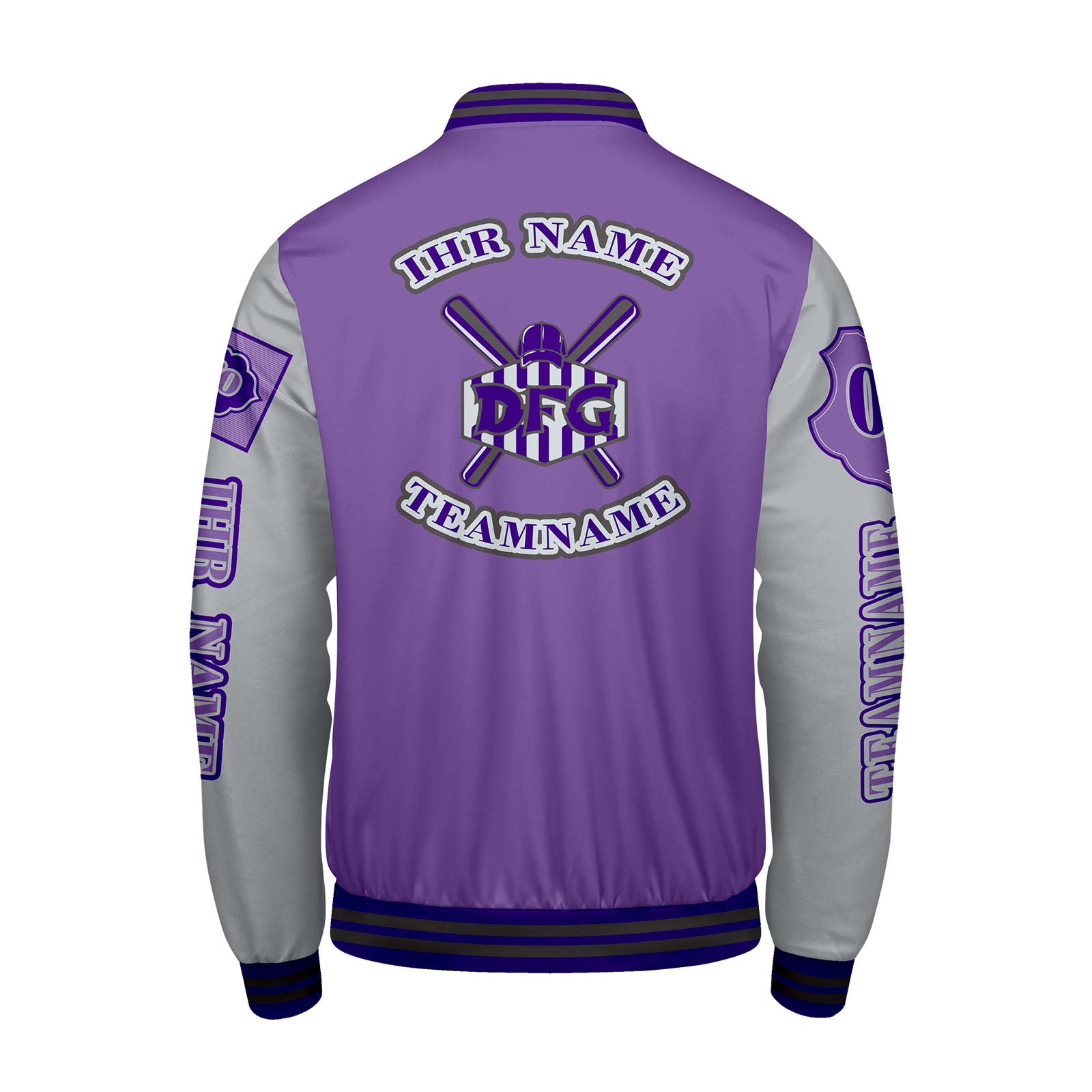 Maßgeschneiderte Lila Lichtgrau Letterman Varsity Jacket Individuelle Stickerei  Druck nach Ihrem Wunsch