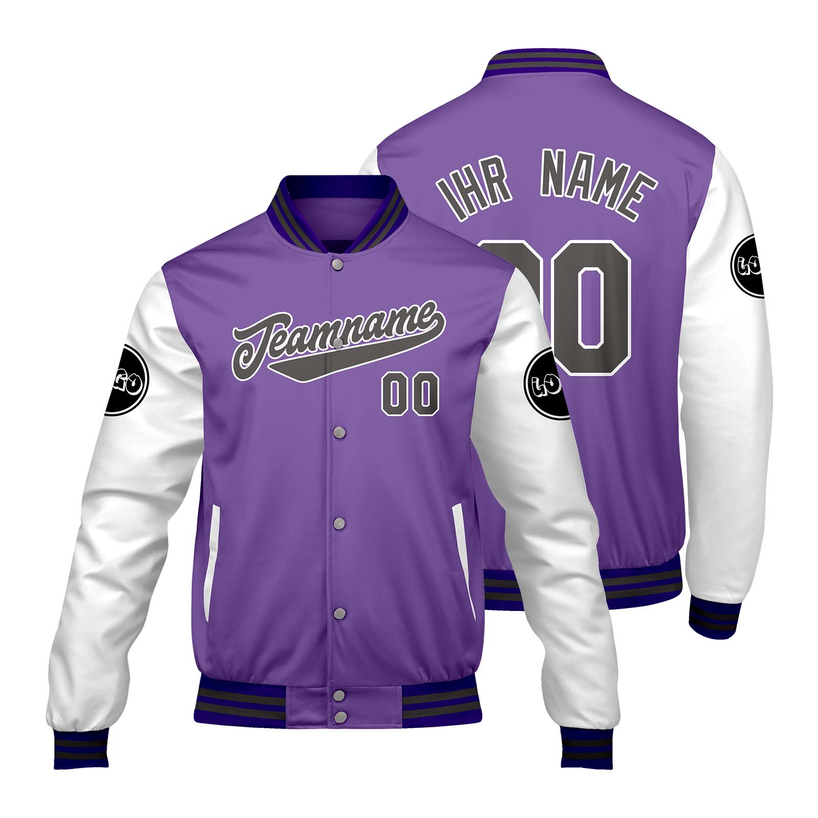 Maßgeschneiderte Lila Weiß Letterman Varsity Jacket Individuelle Stickerei Druck nach Ihrem Wunsch