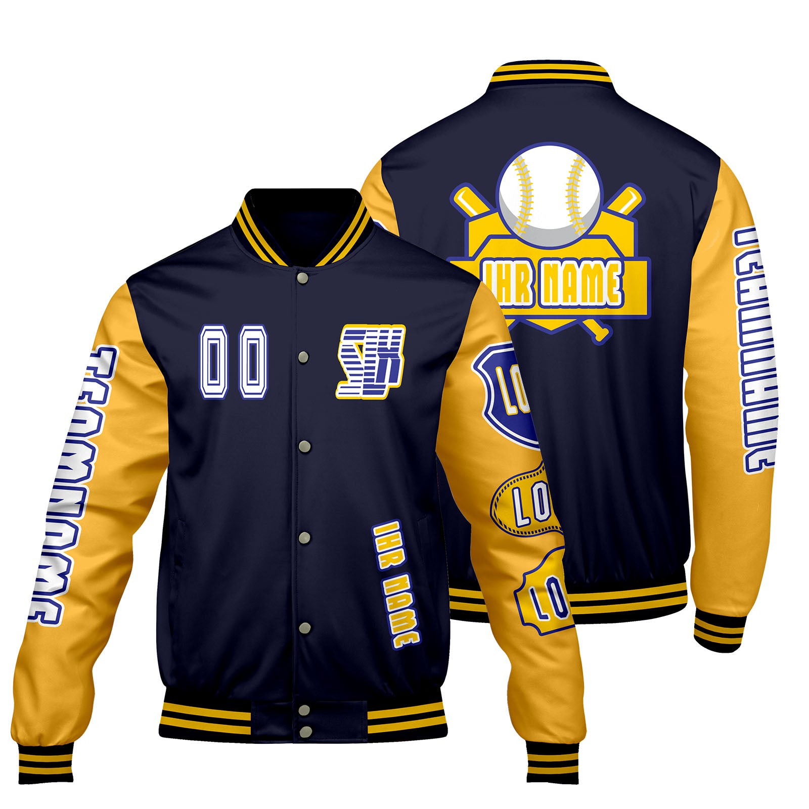 Maßgeschneiderte Marine Gelb Letterman Varsity Jacket Individuelle Stickerei Druck nach Ihrem Wunsch