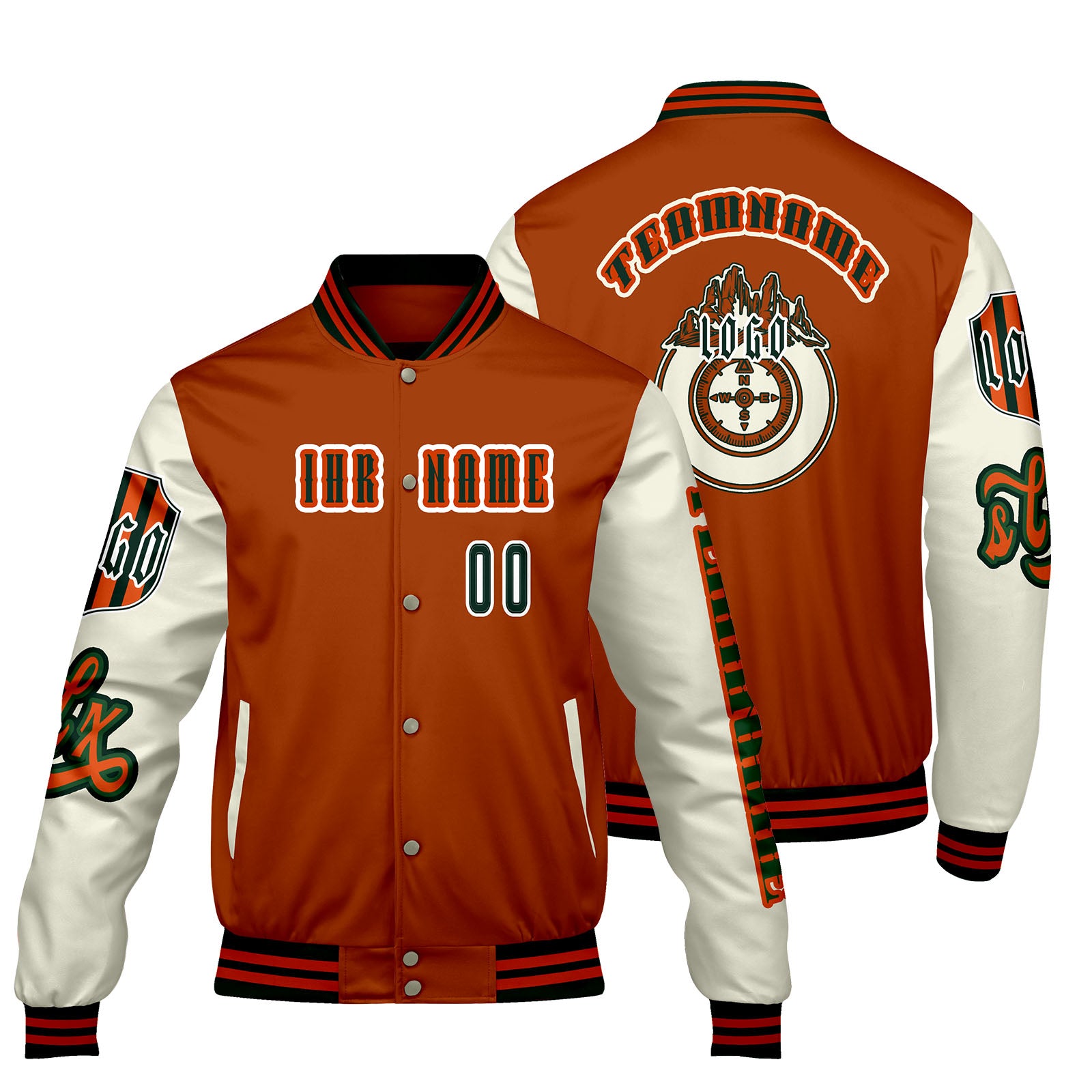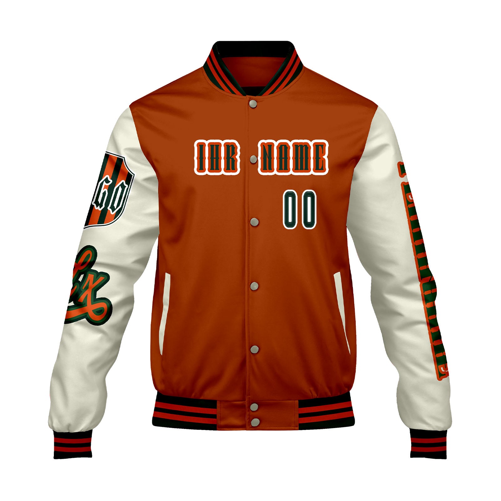 Maßgeschneiderte Orange Weiß Letterman Varsity Jacket Individuelle Stickerei Druck nach Ihrem Wunsch